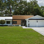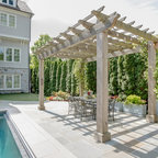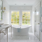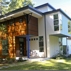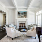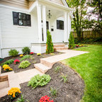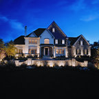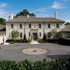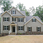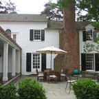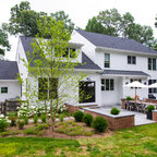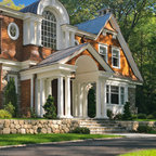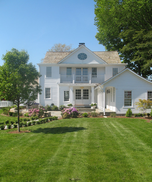 Diseño de fachada de casa blanca, tradicional, grande, de dos plantas, con revestimiento de madera, tejado a dos aguas y tejado de teja de madera — Houzz
