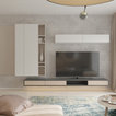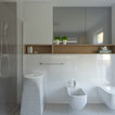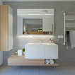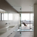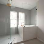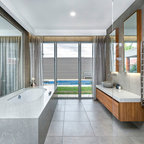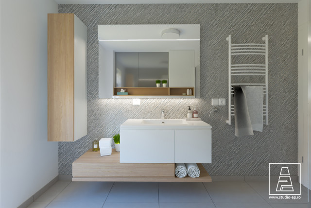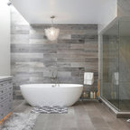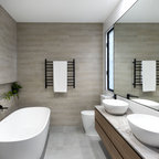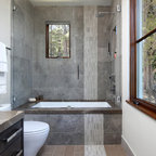 Modelo de cuarto de baño con ducha, minimalista, con sanitario de pared, paredes grises, suelo de baldosas de cerámica, lavabo encastrado, suelo gris y ducha abierta — Houzz