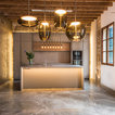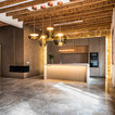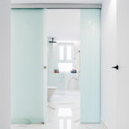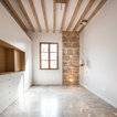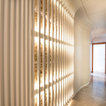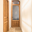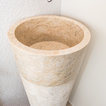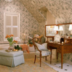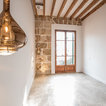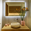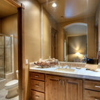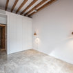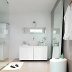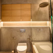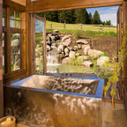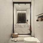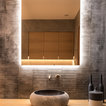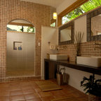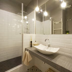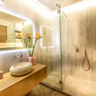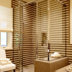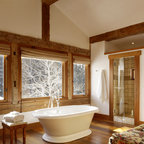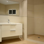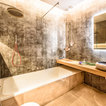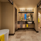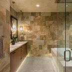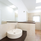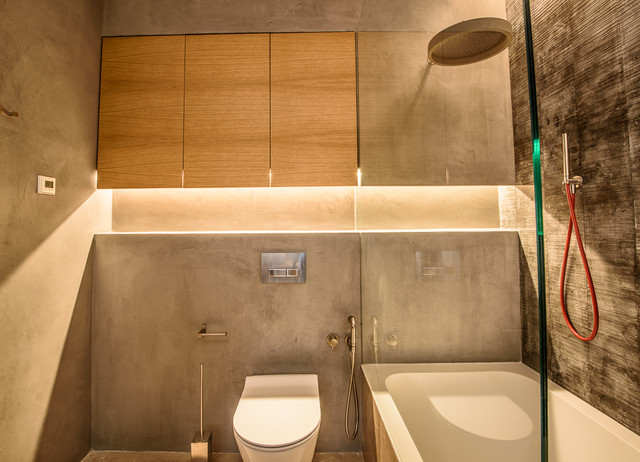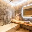 Modelo de cuarto de baño principal, minimalista, grande, con puertas de armario de madera clara, bañera empotrada, baldosas y/o azulejos grises, suelo de piedra caliza, encimera de madera y suelo beige — Houzz