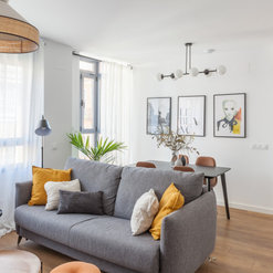 Decoración y fotografía de apartamento en Atocha 55, Madrid. Siguiendo una linea preestablecida de tipo de mueble escandinavo de los años 60. Nora, dentro de un presupuesto, ha sabido adquirir los muebles deseados y, combinarlos con tejidos y elementos de decoración para crear unos espacios chic y elegantes. El apartamento nuevo quedó amueblado con todos los utensilios necesarios en la cocina, dormitorios y baño. A petición, Nora obtuvo dos fotografías, las cuales se exponen en el comedor. La sesión de fotografías para comercializar el apartamento tienen una composición e iluminación muy calurosa y profesional. He quedado muy contento con el trabajo de Nora y la utilizaré en próximos proyectos.