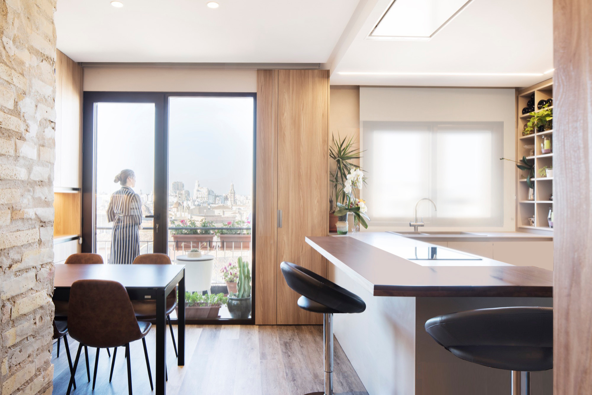 Potenciar las vistas sobre el centro histórico de Valencia y conseguir un espacio funcional para los dueños, un matrimonio con dos hijos, fueron los objetivos de la reforma de esta cocina en Valencia. “Se trata de poder comer o cocinar con vistas”, resumía el responsable del proyecto, Juan Pablo Más, en este reportaje.