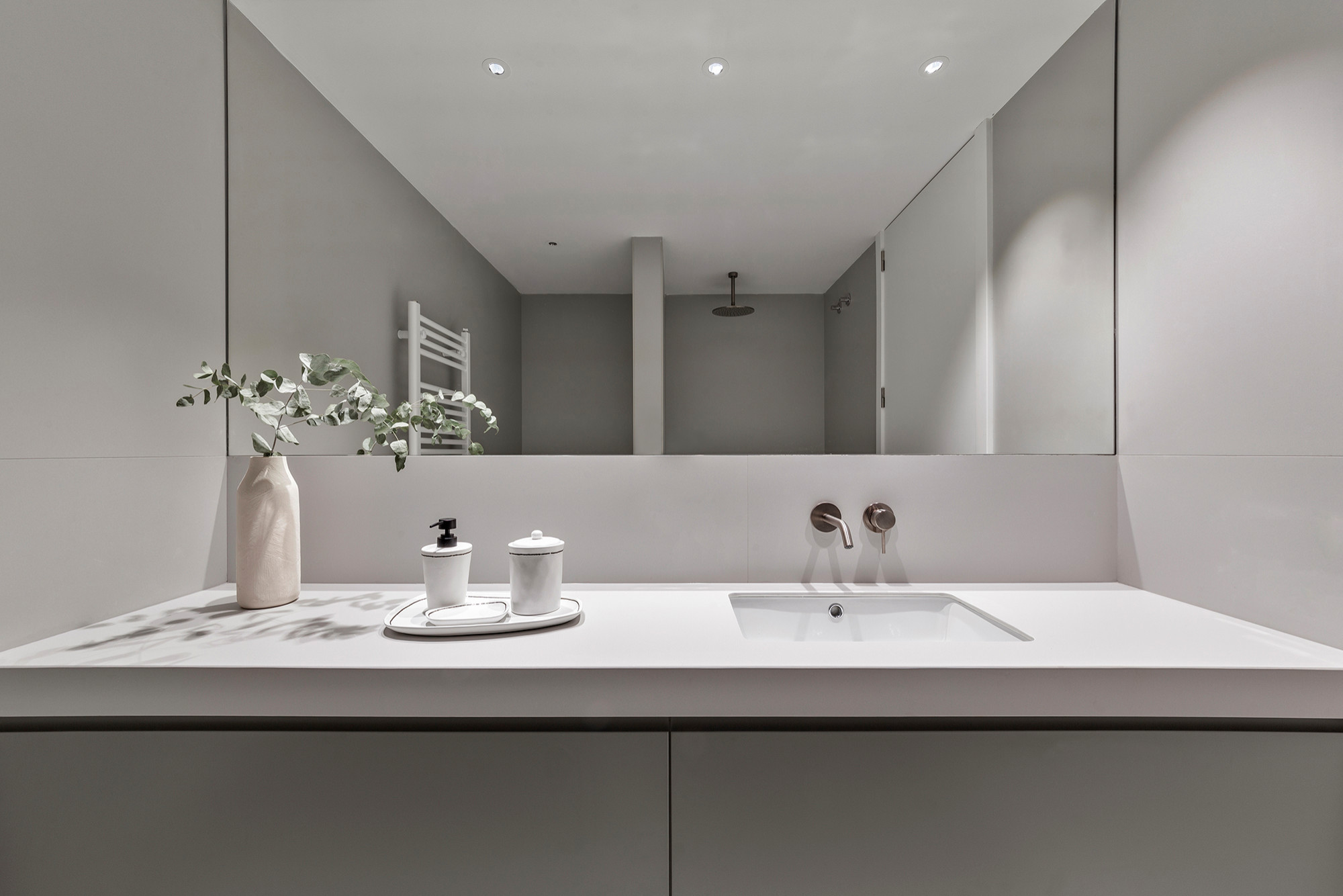 2. Un cuarto de baño con un gran espejo cuadrado para duplicar el espacio