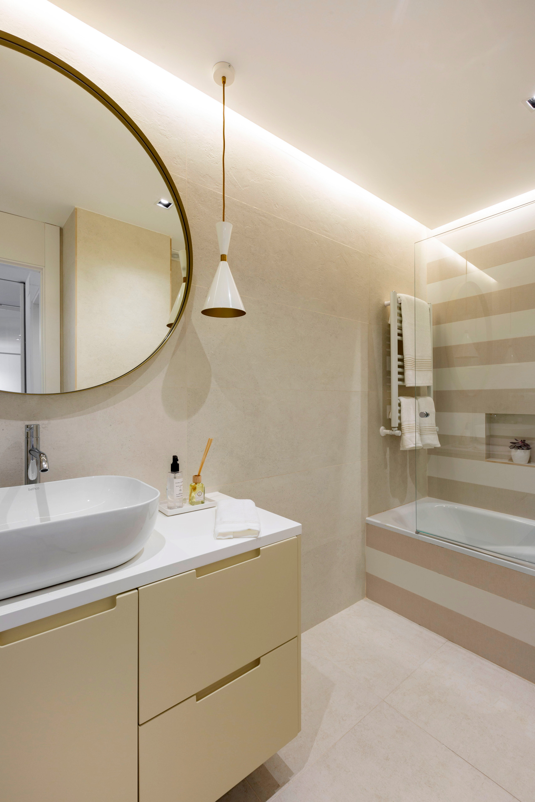 Los propietarios de esta casa en Madrid contactaron con Melchora Vidal-Pardo, de Crea Spacios, a través de Houzz, porque uno de los cuartos de baño de su vivienda resultaba agobiante y oscuro. “Querían hacerlo más espacioso y poner un lavabo más grande y cómodo”, contaba aquí la profesional, indicando que ha apostado por los tonos beige, para que el baño gane en luminosidad. El resultado es un éxito: los dueños destacan de su nuevo baño su calidez y la amplitud.