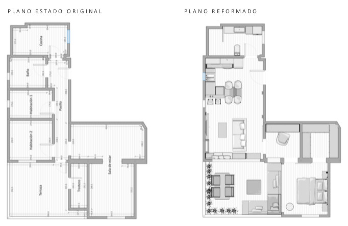 Plano de la vivienda antes (izq.) y después de la reforma. Para configurar el salón actual se han unido tres estancias; también se ha creado un nuevo dormitorio luminoso, dos zonas auxiliares adicionales, vestidor y despacho