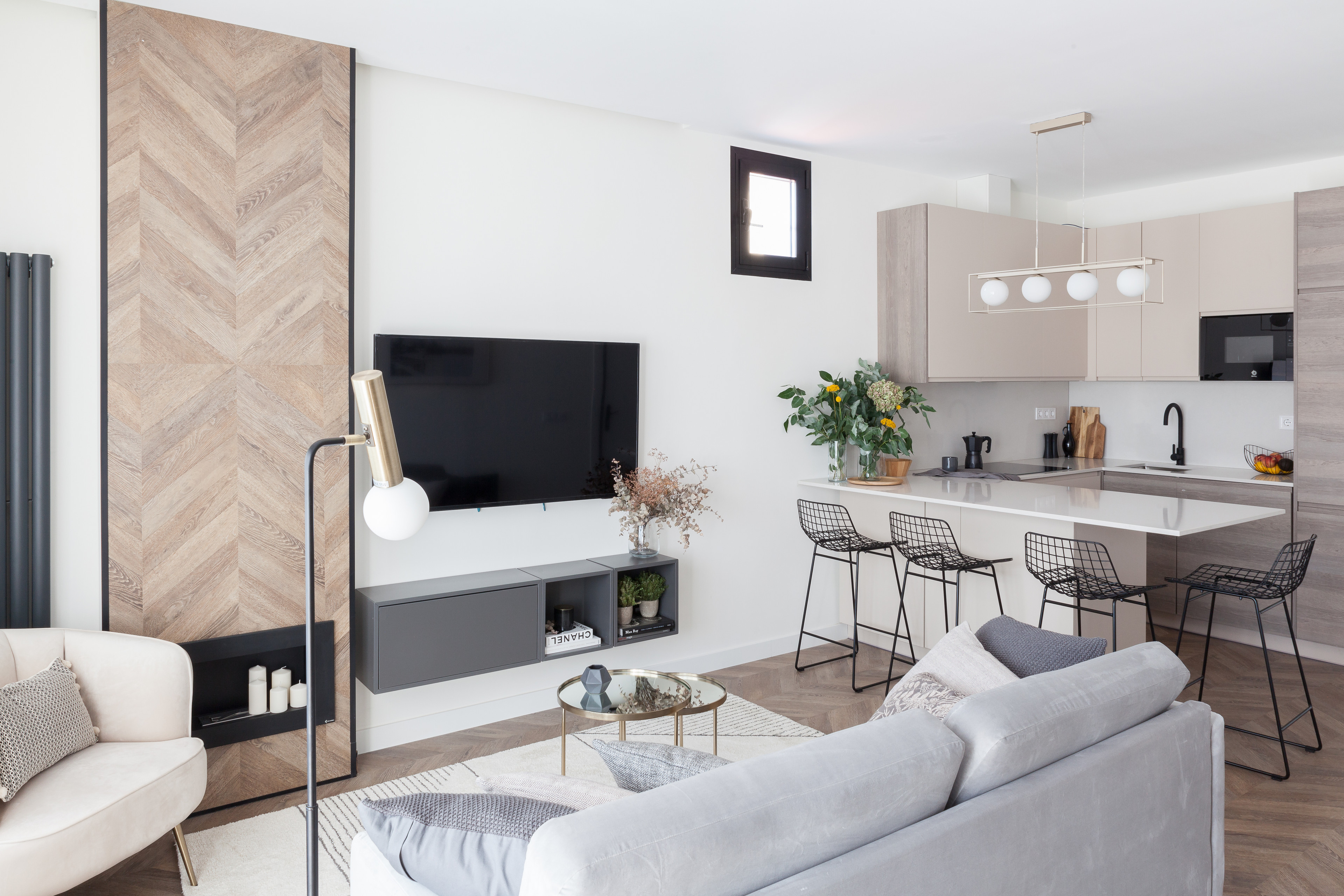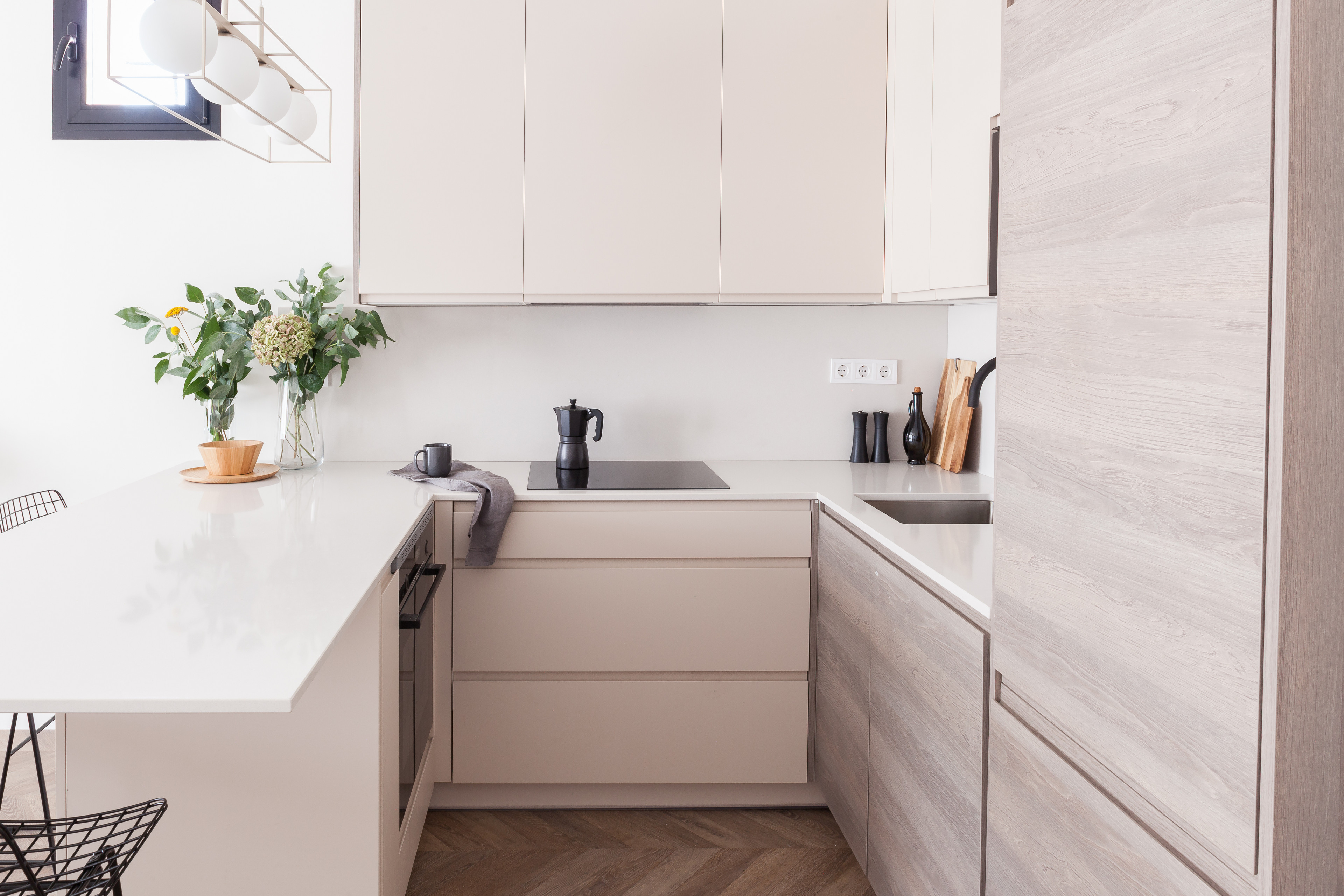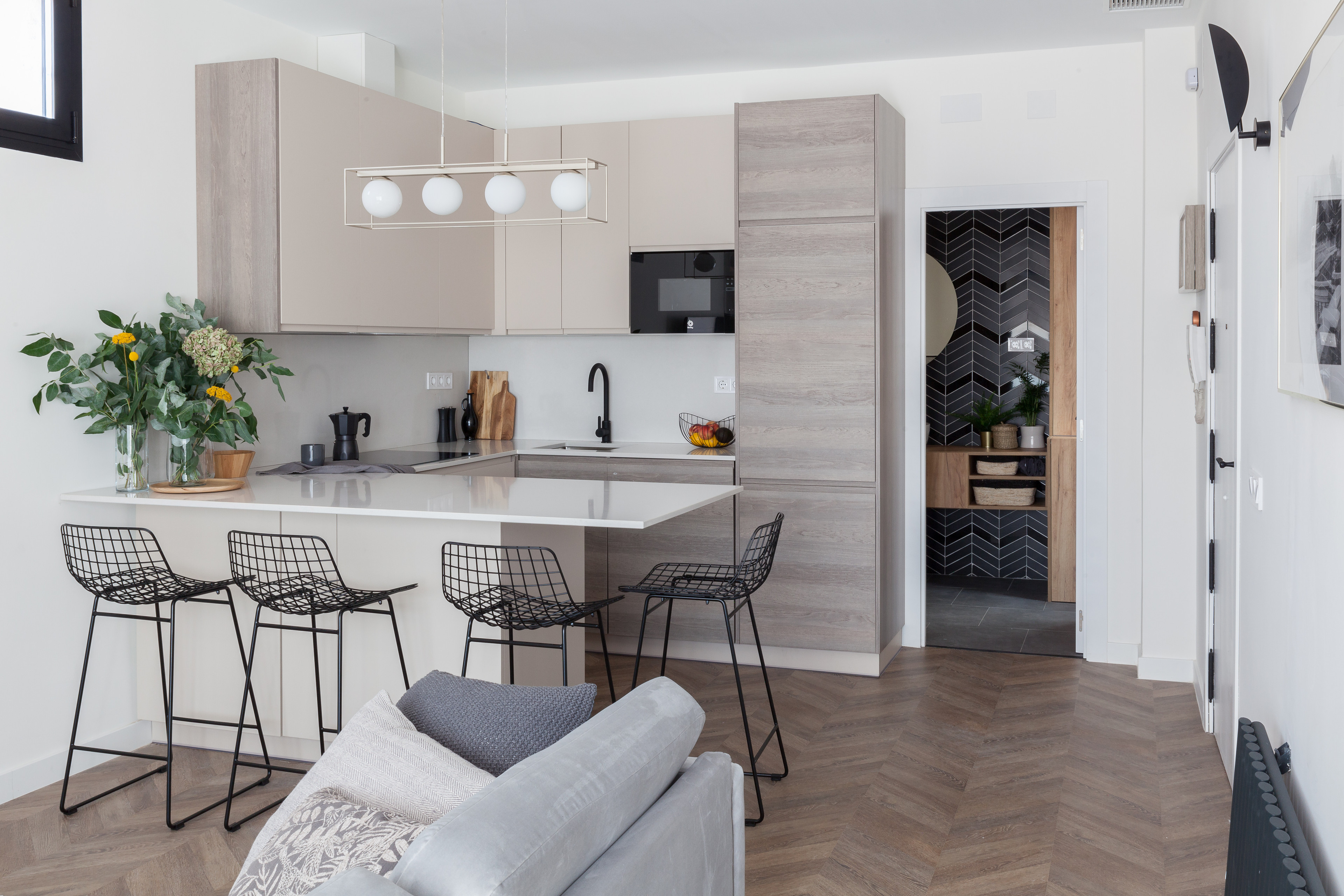 “De la cocina destacaría el color cashmere combinado con madera. Queríamos no se viera como la típica cocina y que se fundiera con el mobiliario del salón. Por eso, optamos por colores poco habituales en la cocina y añadimos grifería y electrodomésticos de color negro para que se viera todo muy elegante”, cuenta Zubia.