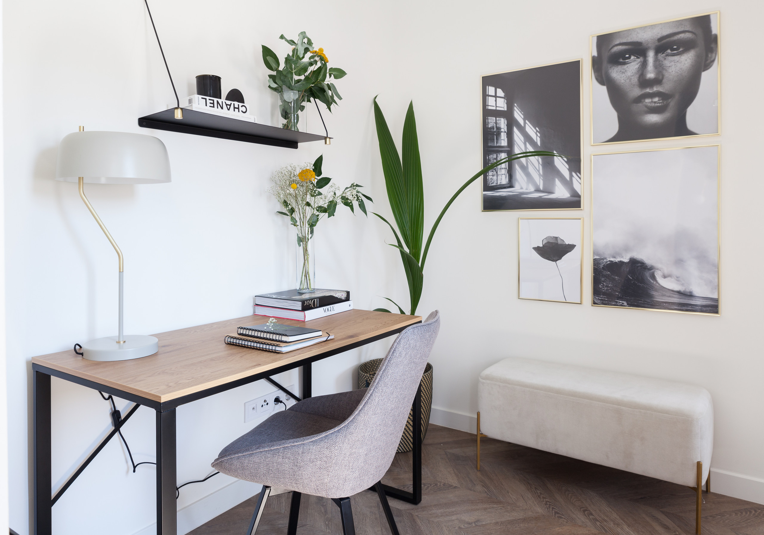 La zona de trabajo es muy coqueta y recogida. “Teníamos un muro de carga que nos condicionaba toda la zona del dormitorio, así que quisimos potenciarlo dándole un uso especial creando una zona de trabajo. Hemos aislado el dormitorio del salón y, al mismo tiempo, se ha ganado un espacio de trabajo. El piso no tiene muchos metros, pero era importante contar con un despacho y no invadir el salón o el dormitorio para trabajar”.