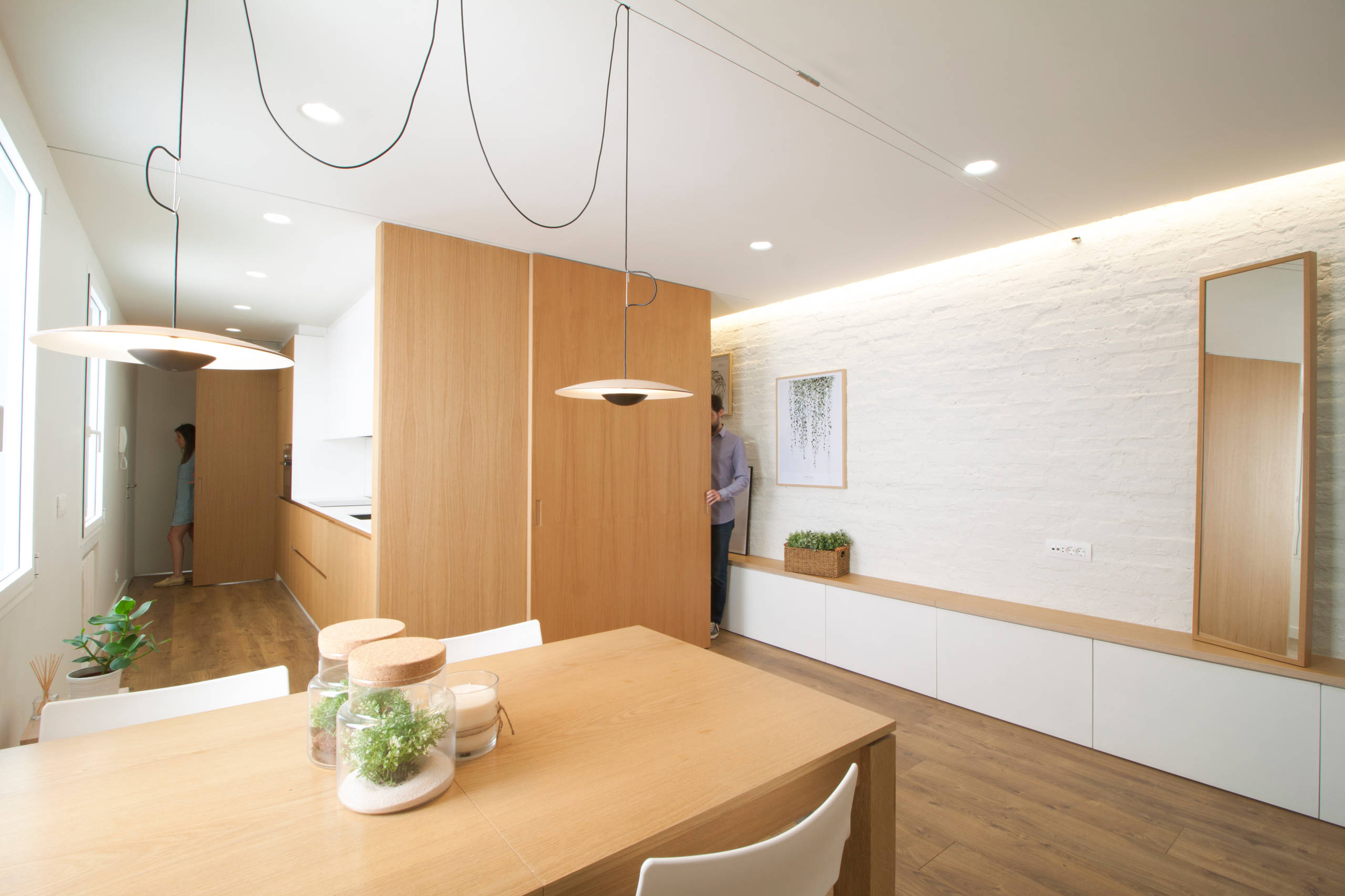 El interior de la casa de este arquitecto en Zaragoza gira en torno a un volumen de madera que ocupa lo que antes era el largo pasillo. Este volumen de madera tiene un doble uso que le encanta al propietario de la casa. “El mueble no solo sirve de armario, sino que por un lado es cocina y por el otro, oficina”, explicaba el arquitecto en el reportaje de la casa, añadiendo que las dos grandes puertas correderas, de 2,50 m de alto x 1,40 m, tuvieron que introducirse con grúa en la vivienda.