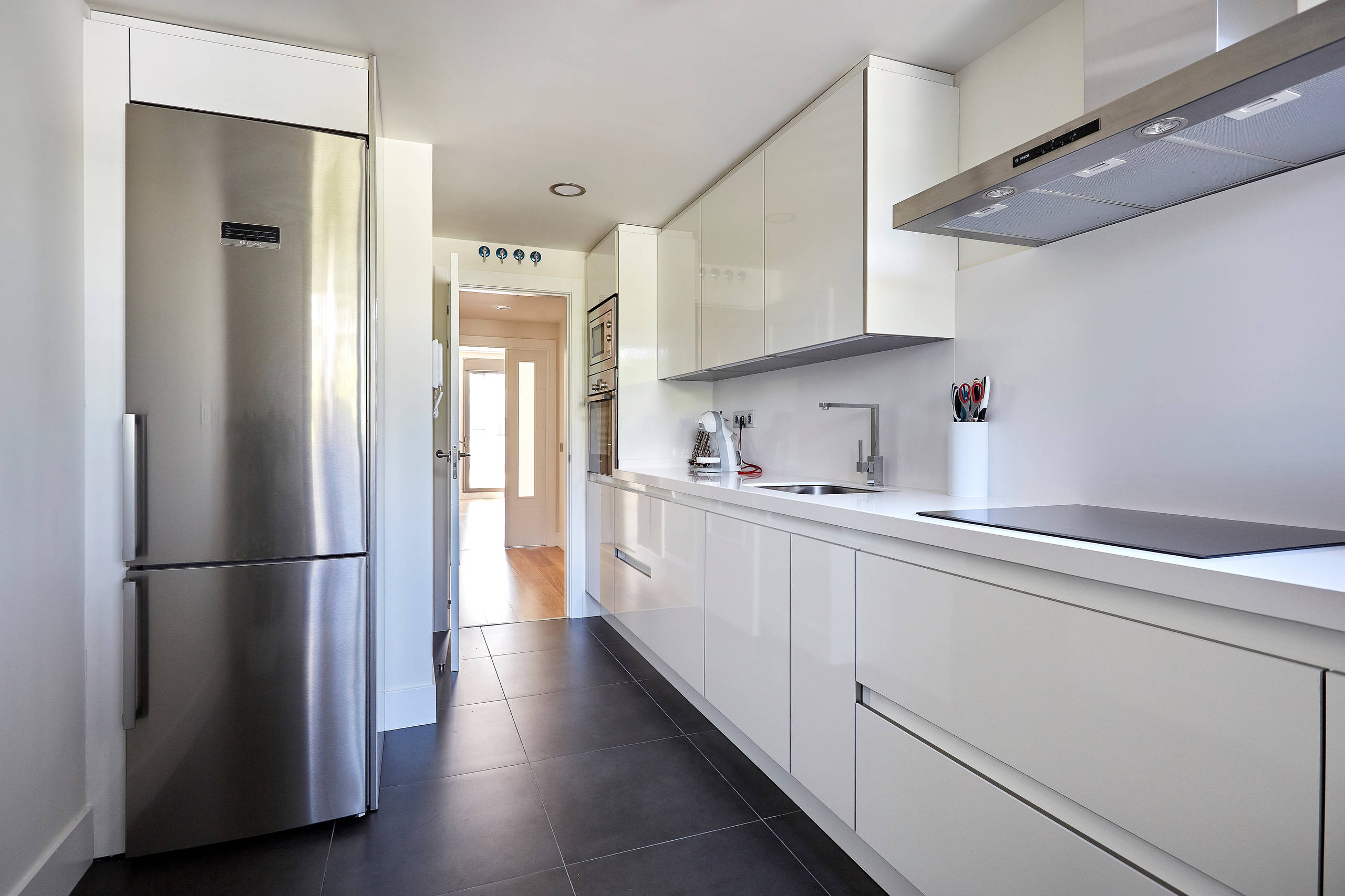 En el barrio de Guinardó, el del ‘Pijoaparte’ de Marsé en Últimas tardes con Teresa, está este piso con esta bonita cocina blanca y moderna.