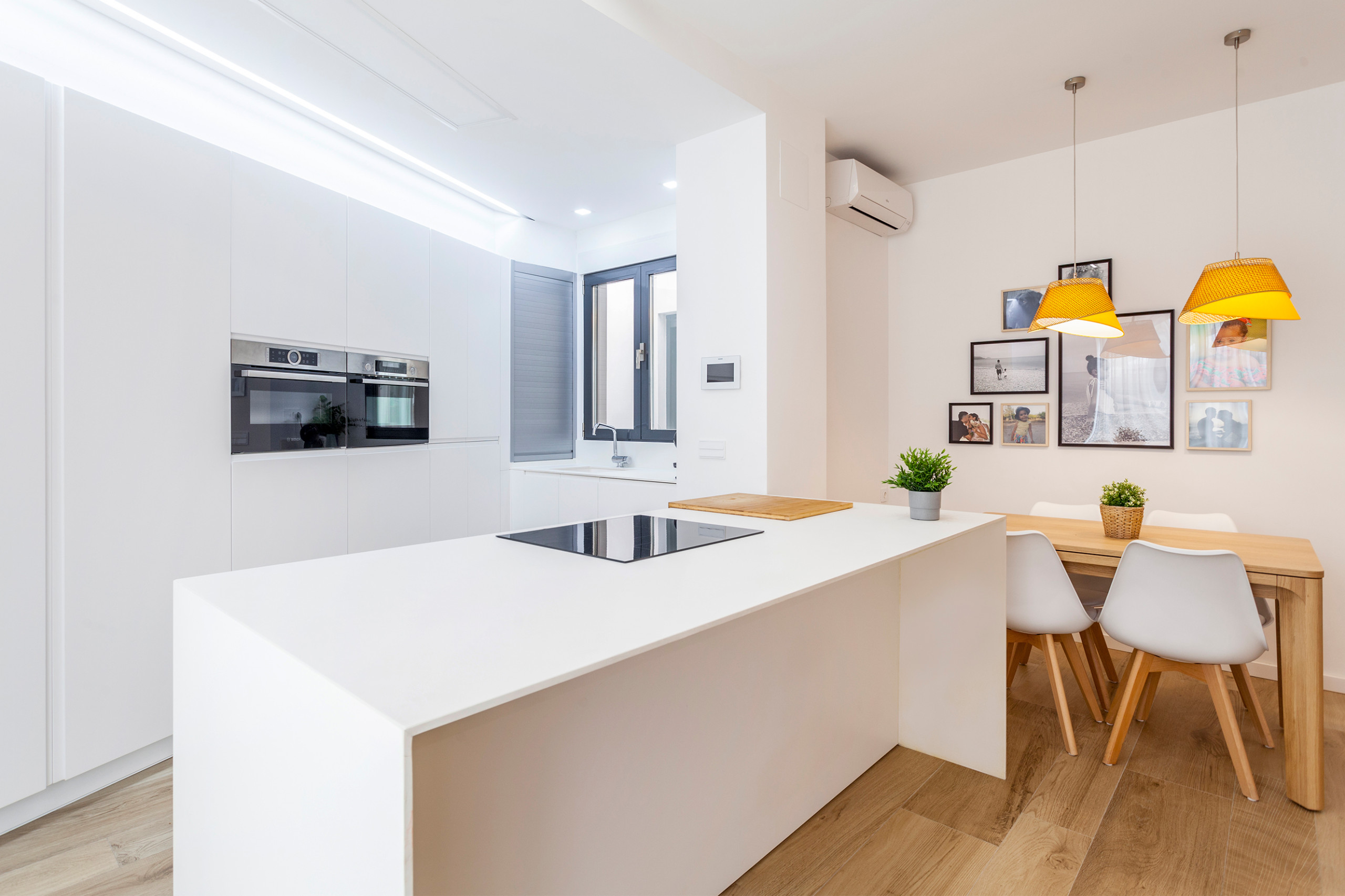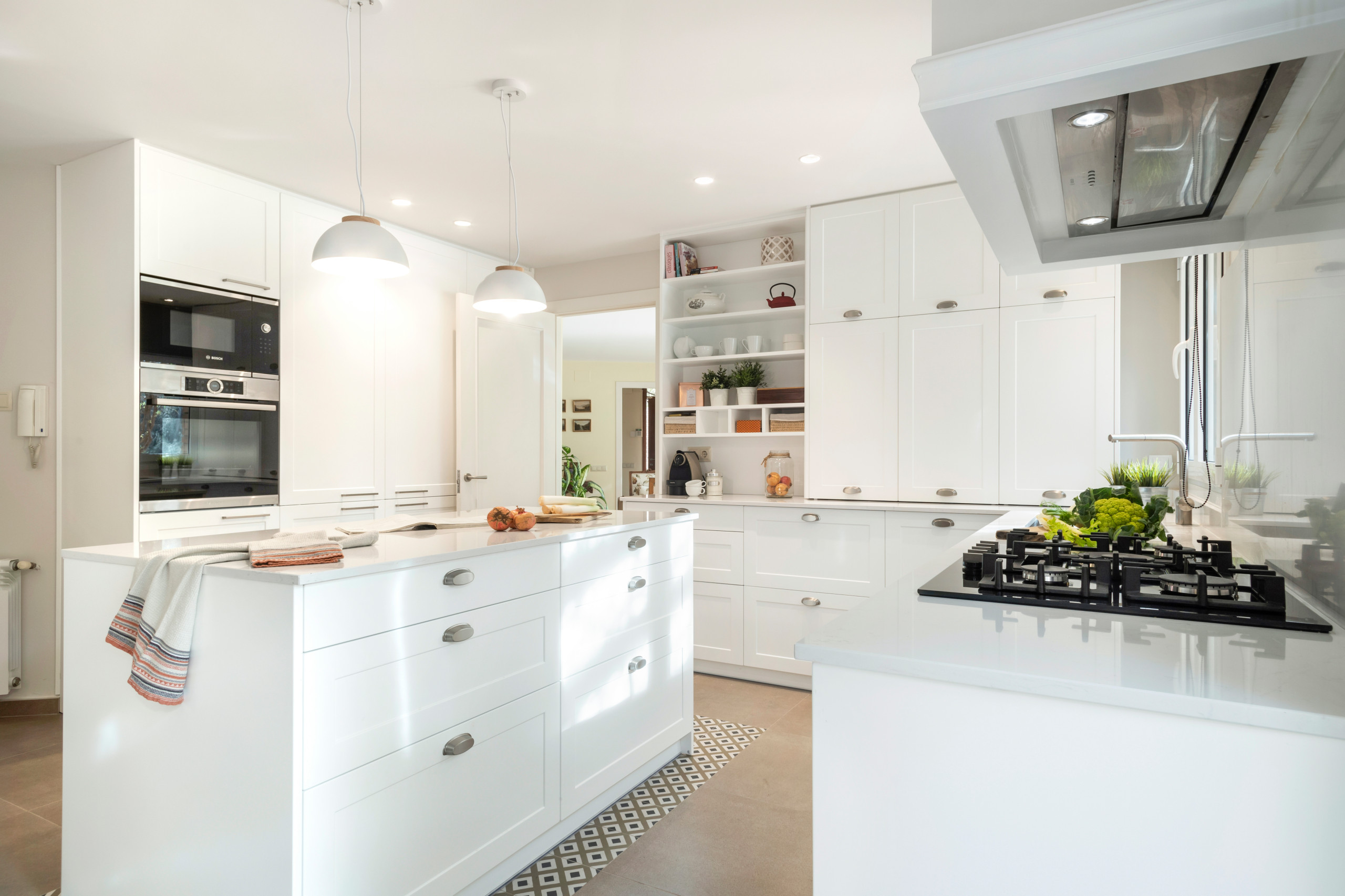 Esta cocina blanca moderna de líneas rectas, cuyo presupuesto ha sido de unos 14.300 € (IVA incluido), encaja como un guante en esta casa de pueblo en cuya reforma se han mantenido varios elementos originales.
