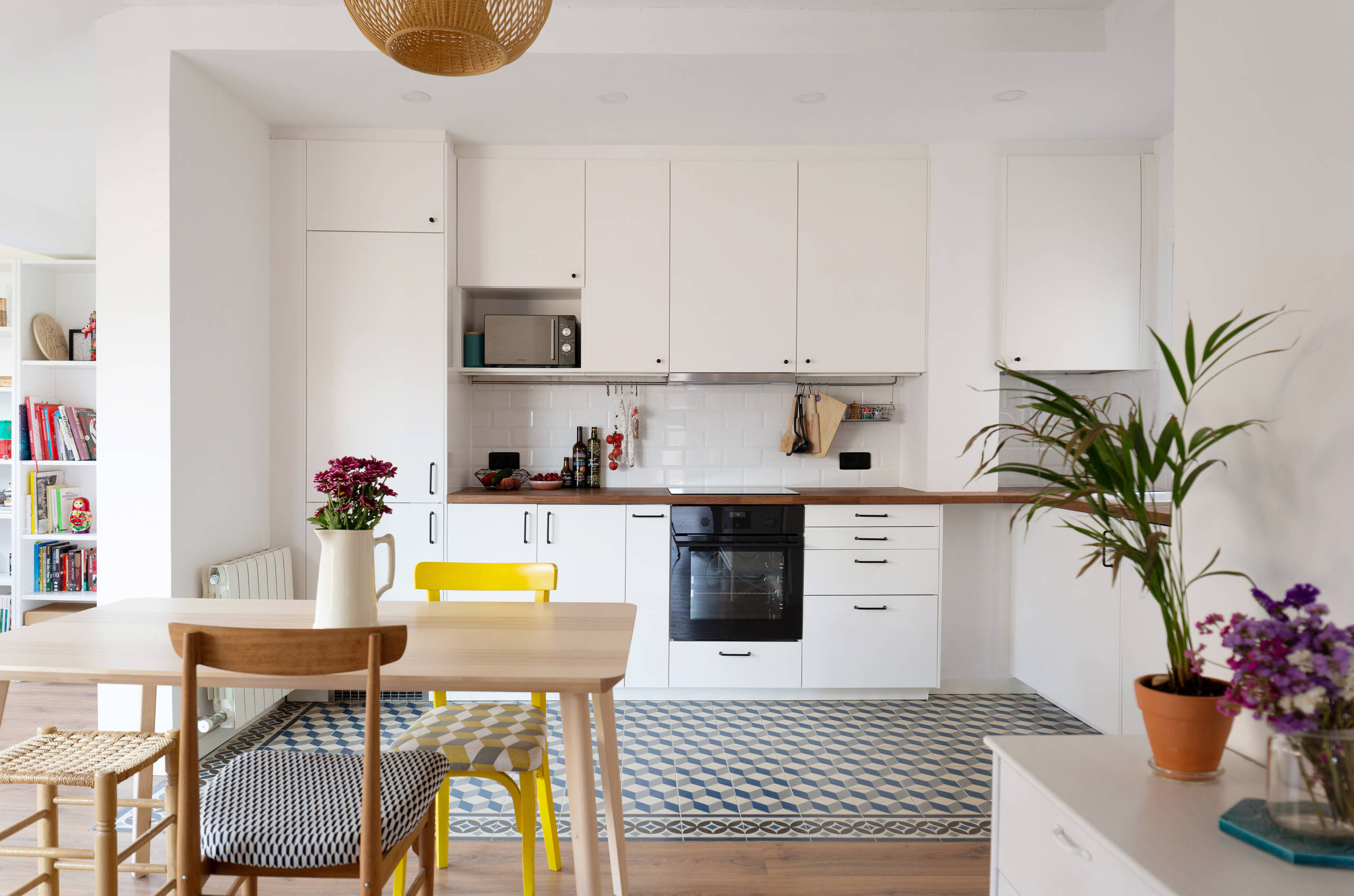 En todo el piso el blanco es el color predominante para aportar sensación de amplitud. Así, se han creado contrastes mediante pequeños toques, véase el suelo de parqué y el porcelánico. “Para la cocina utilizamos encimera de nogal, tiradores de puerta negros, baldosas blancas estilo metro y ganchos a la vista para colgar los tradicionales tomates y embutidos de la comarca y darle un aire auténtico y acogedor a este espacio. Siempre prestamos especial atención a la cocina, que muchas veces es el corazón de la casa”, explica la profesional.