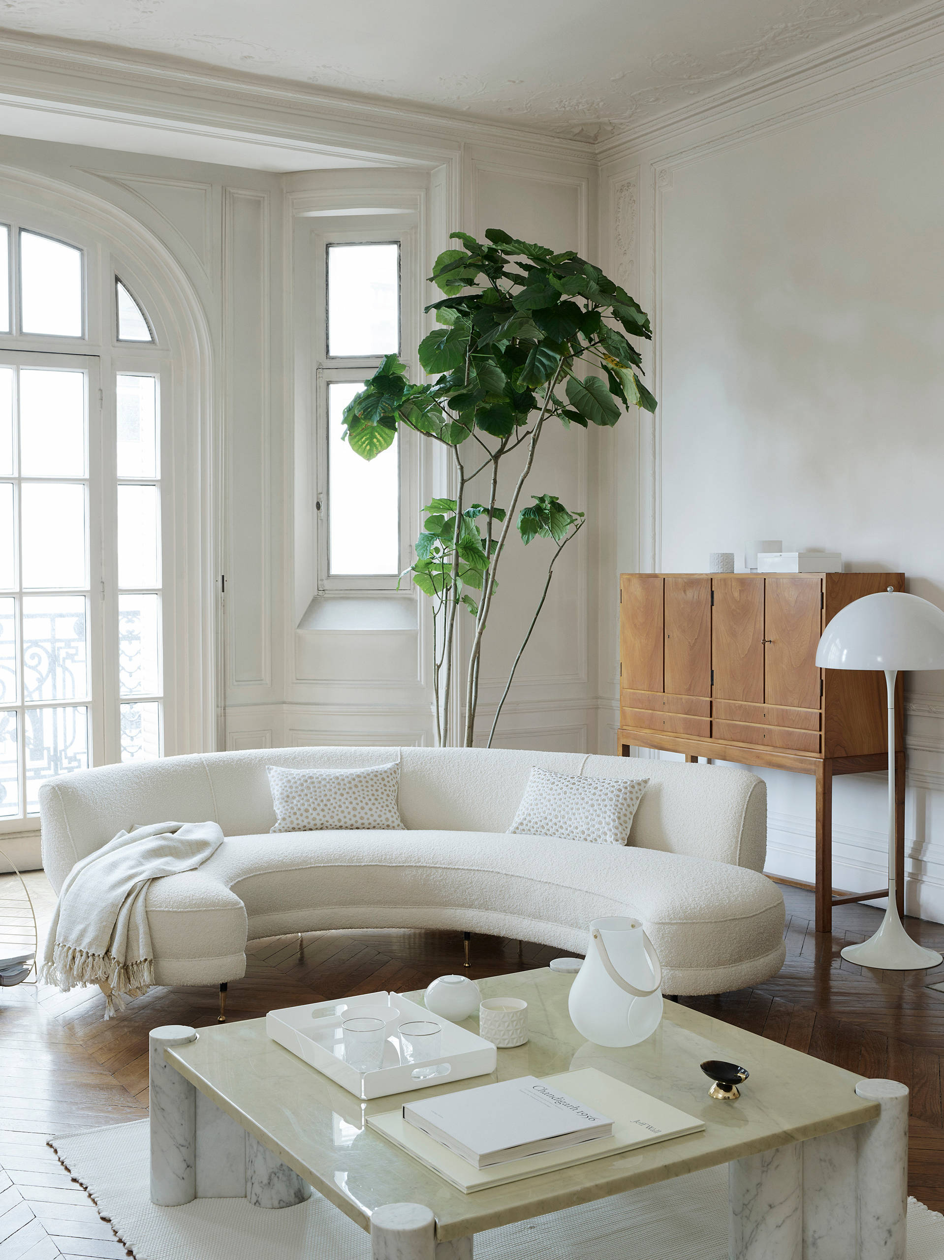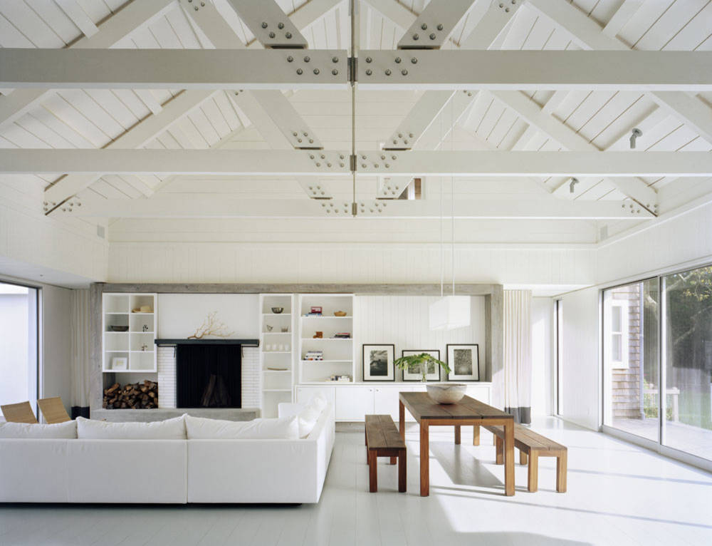 En detalle: en un salón de techos altos con espectaculares bovedillas y ventanales, decora con blanco para un ambiente sereno.