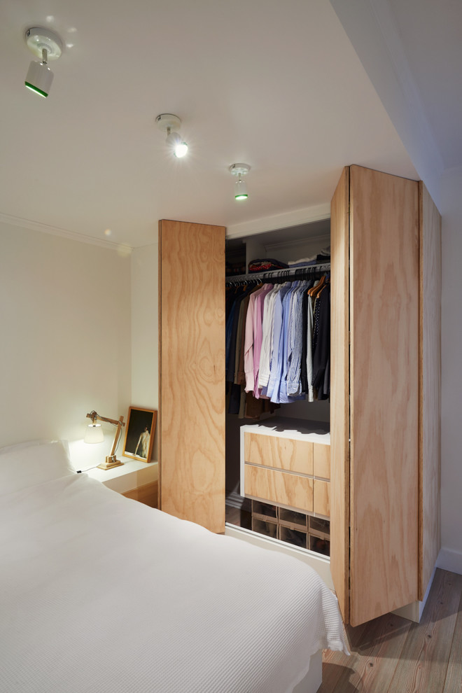 - Concebir un armario ajustado al espacio en concreto donde se ubica, hará que moleste menos. En la imagen, por ejemplo, el armario se ajusta a un rincón difícil, lo que permite ubicar la mesilla. Por otro lado, el sistema plegable de puertas hace que sea fácil de usar, estando muy cerca de la cama.