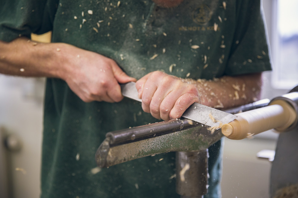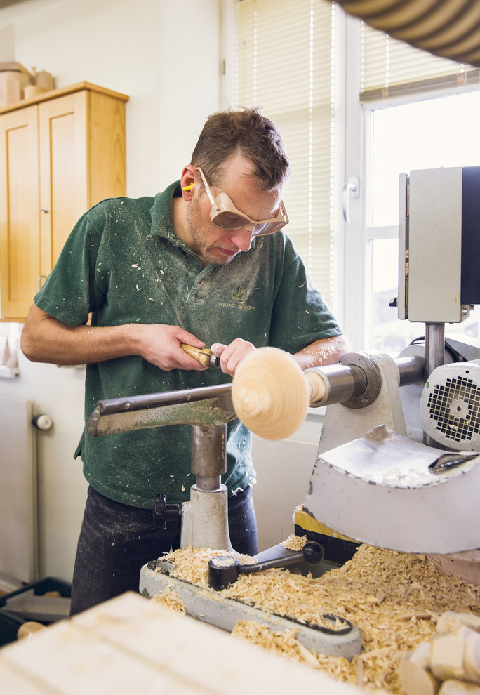 Una vez seca, la madera va directa al taller de torneado. Aquí el torneador y el torno mecánico la moldean poco a poco. “La mano del torneador crea las extremidades del cuerpo, los rizos de los ángeles y las ropas. Para esto se necesita mucha pericia, años de práctica y tener sentido de la proporción. En resumen, mucha habilidad”, continúa Thiele.