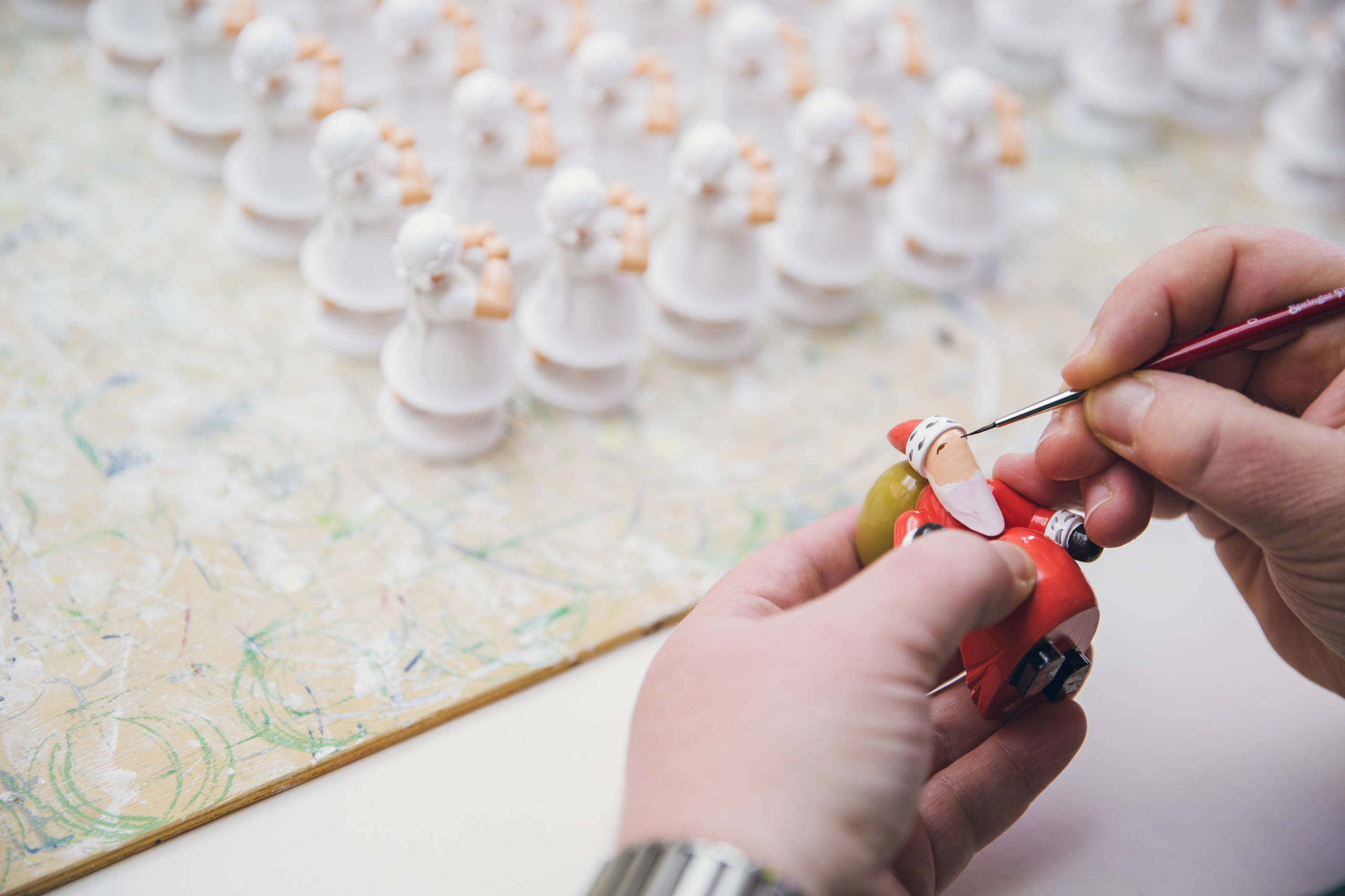 En este proceso de pintado casi únicamente intervienen mujeres. Trabajan en mesas corridas y todas juntas. Aquí intervienen unos 70 empleados, que, con una habilidad increíble y mucha paciencia, dan vida a los personajes con el pincel dibujando las mejillas rojas de los músicos, el gorro del hombrecito de navidad o los 11 puntitos de las alas de los ángeles.