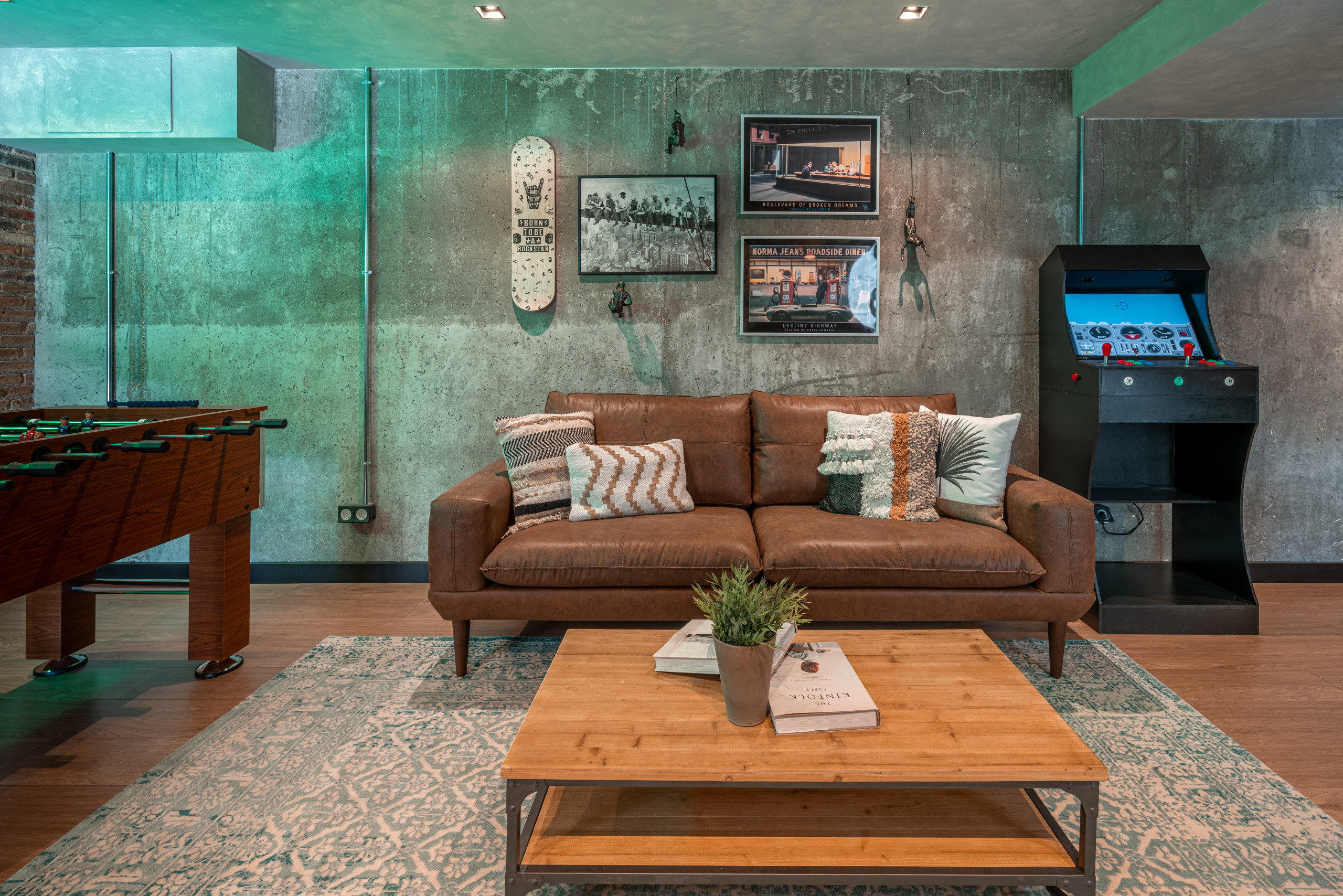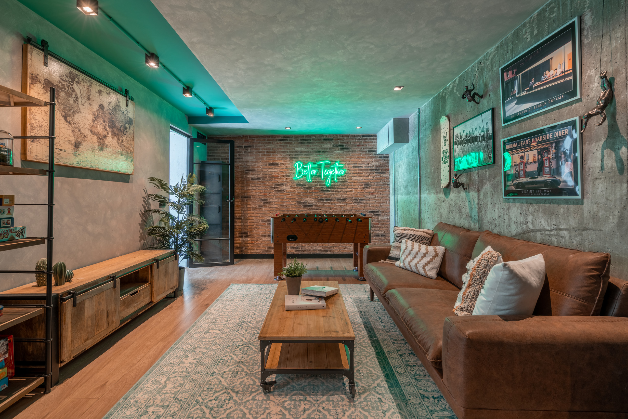 Así, con el hormigón como base, Sánchez ha buscado toques de acento “y chispa” usando el color verde menta del techo y un neón, “que añade un punto atrevido, aporta mucha luz y refleja, además, un mensaje muy personal sobre el concepto de familia que tienen los propietarios: ‘Better Together’ (Mejor juntos)”.