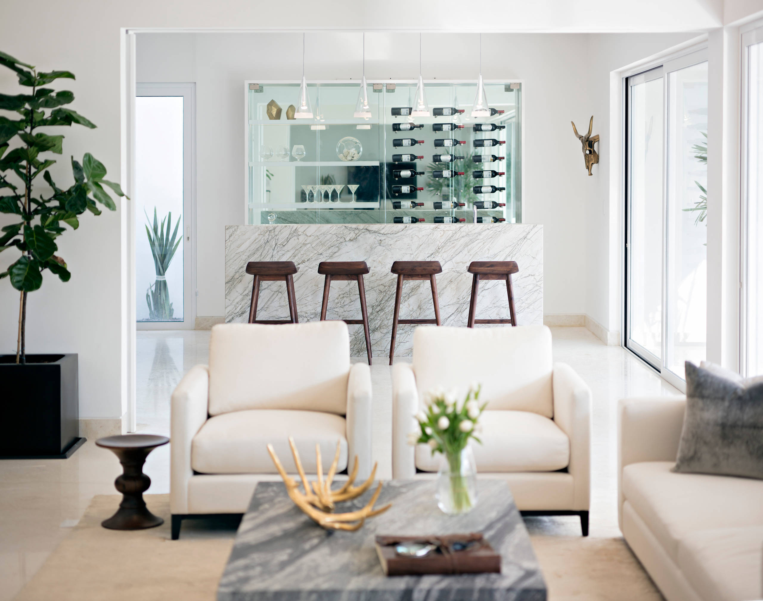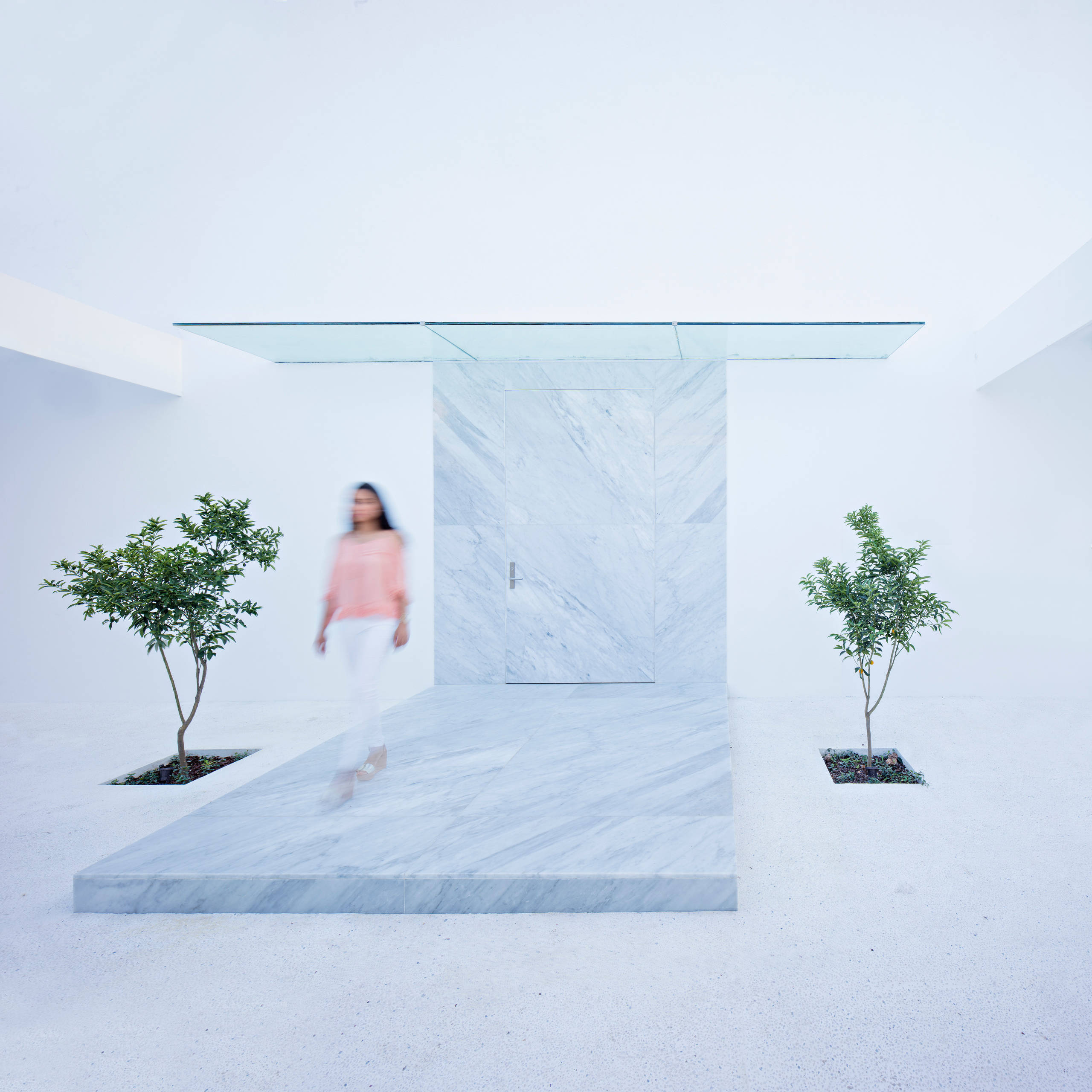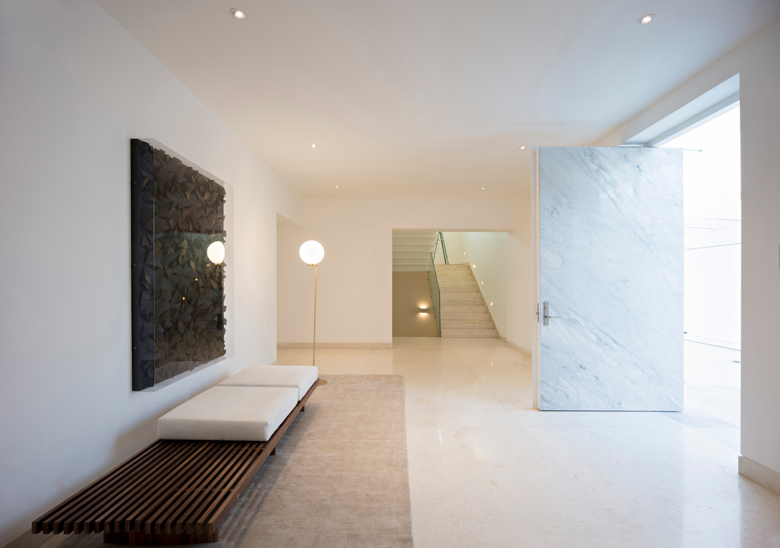 La sutileza minimalista de la fachada da paso a una neutralidad en el acceso a la vivienda que busca enfatizar detalles muy definidos, como los árboles, el mármol y el vidrio, que conectan y le dan continuidad al ambiente y al propio diseño. Desde el inicio, el visitante percibe un recorrido puro y esencial con la luz como motivo recurrente, y donde cada elemento ha sido concebido para capturar y potenciar su calidad estética.
