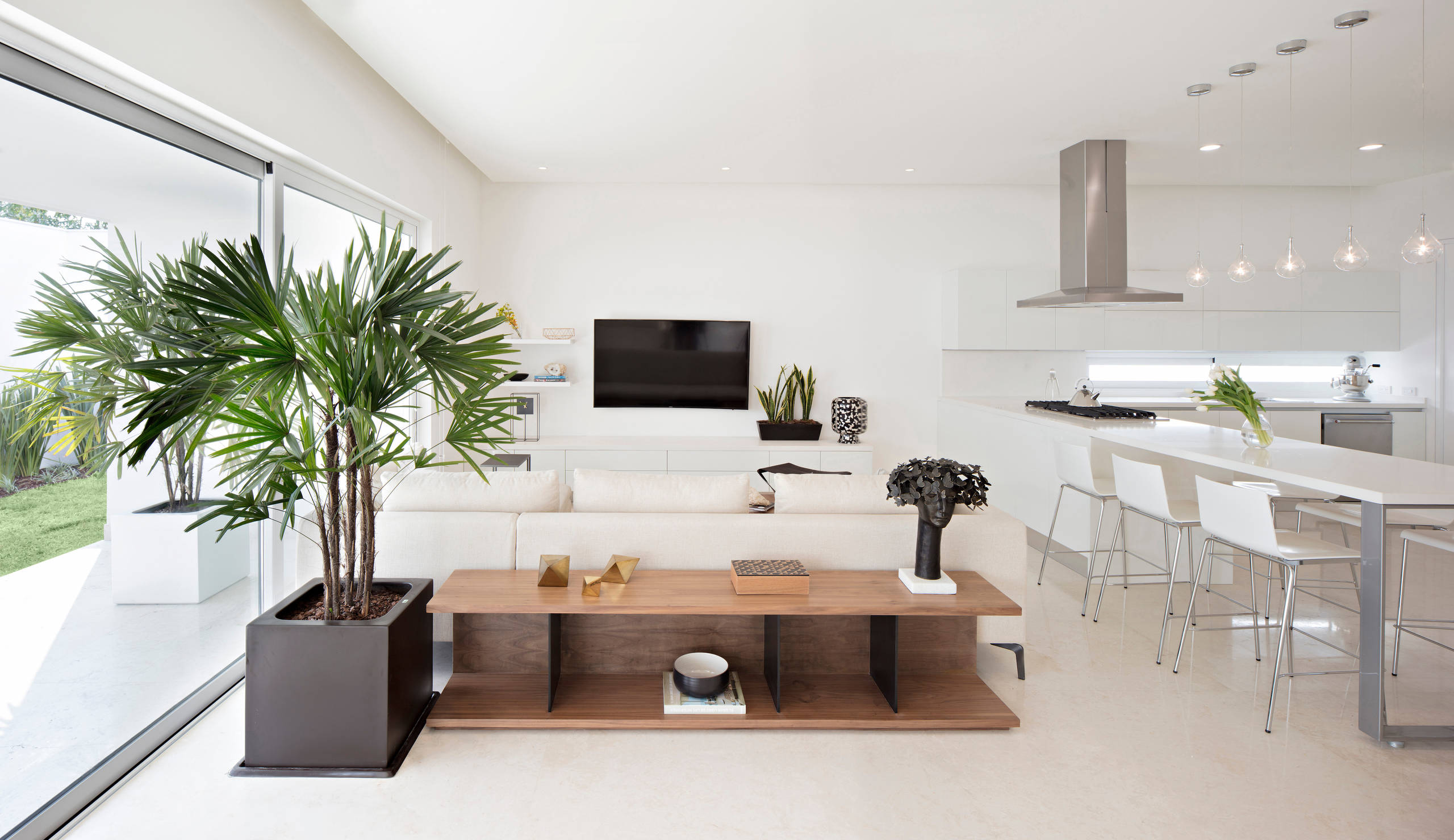 El esquema arquitectónico se realizó mediante la unión de dos espacios conectados y sobrepuestos de doble altura, que actúan como el núcleo y el corazón de la casa, conformando tres niveles que se entrelazan. En la planta baja, se ubicaron áreas públicas como la sala, el comedor, la cocina o el cuarto para ver la televisión y el bar.