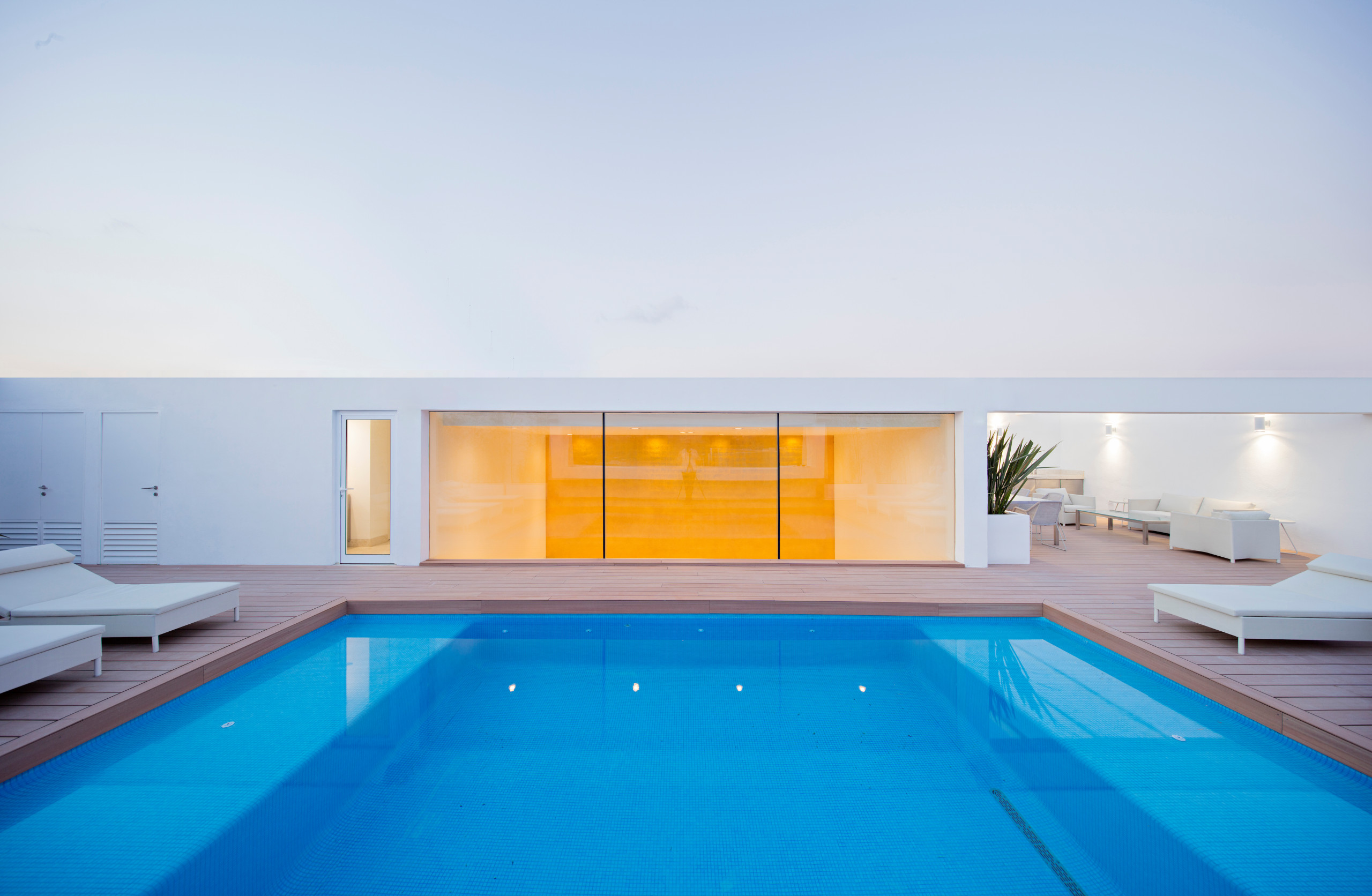 En la terraza de la azotea, el tono oro del interior contrasta con el azul de la piscina y el cielo, logrando un juego cromático maestro.