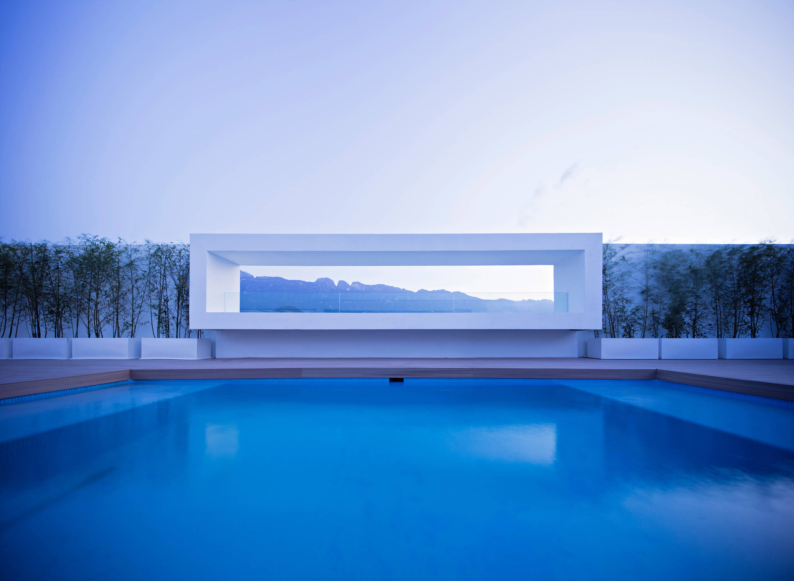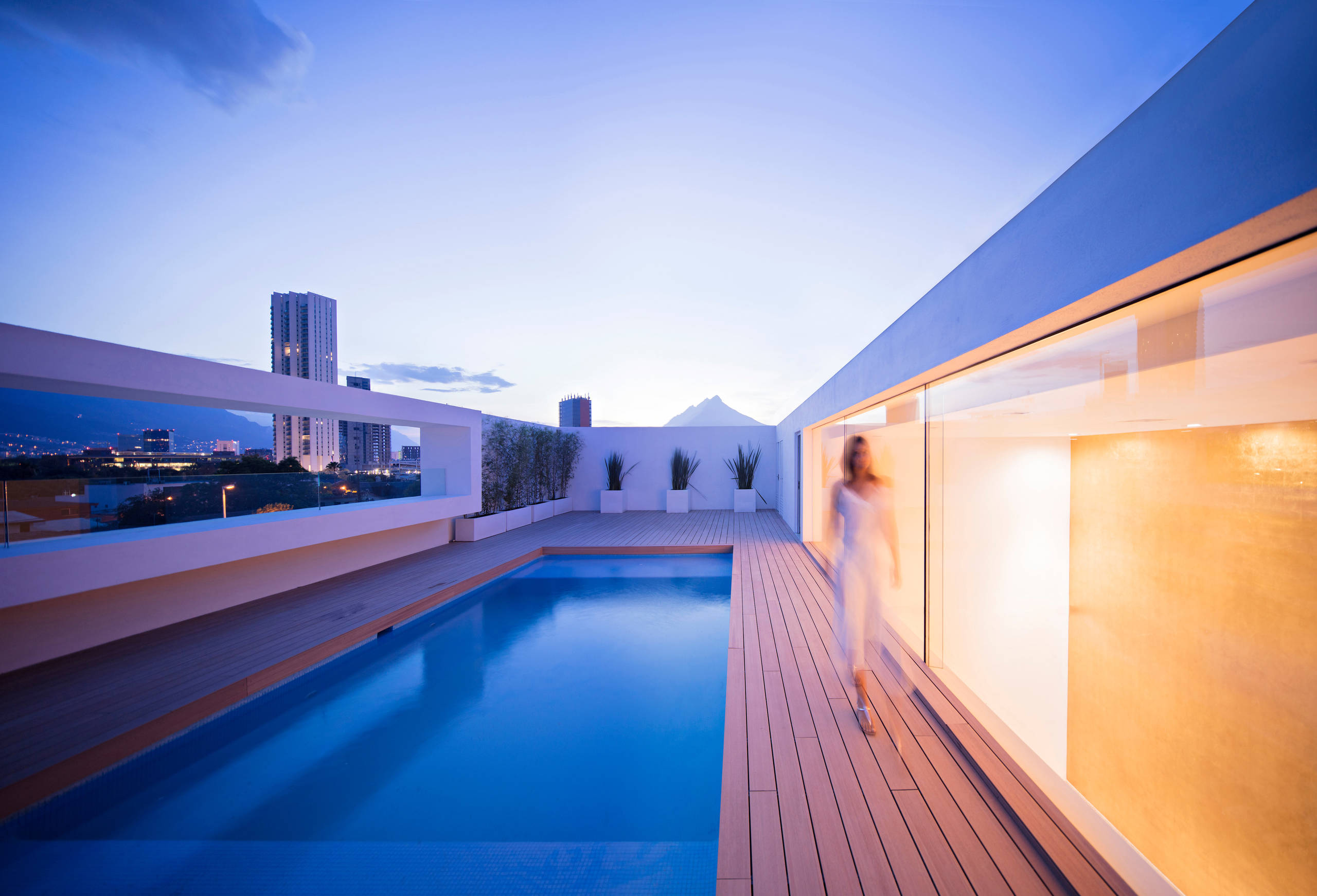 En la azotea encontramos la piscina, con un ventanal que da directamente a la sala de lectura con el muro dorado. Justo al otro lado, un rectángulo vacío enmarca las vistas a la Sierra Madre Oriental.
