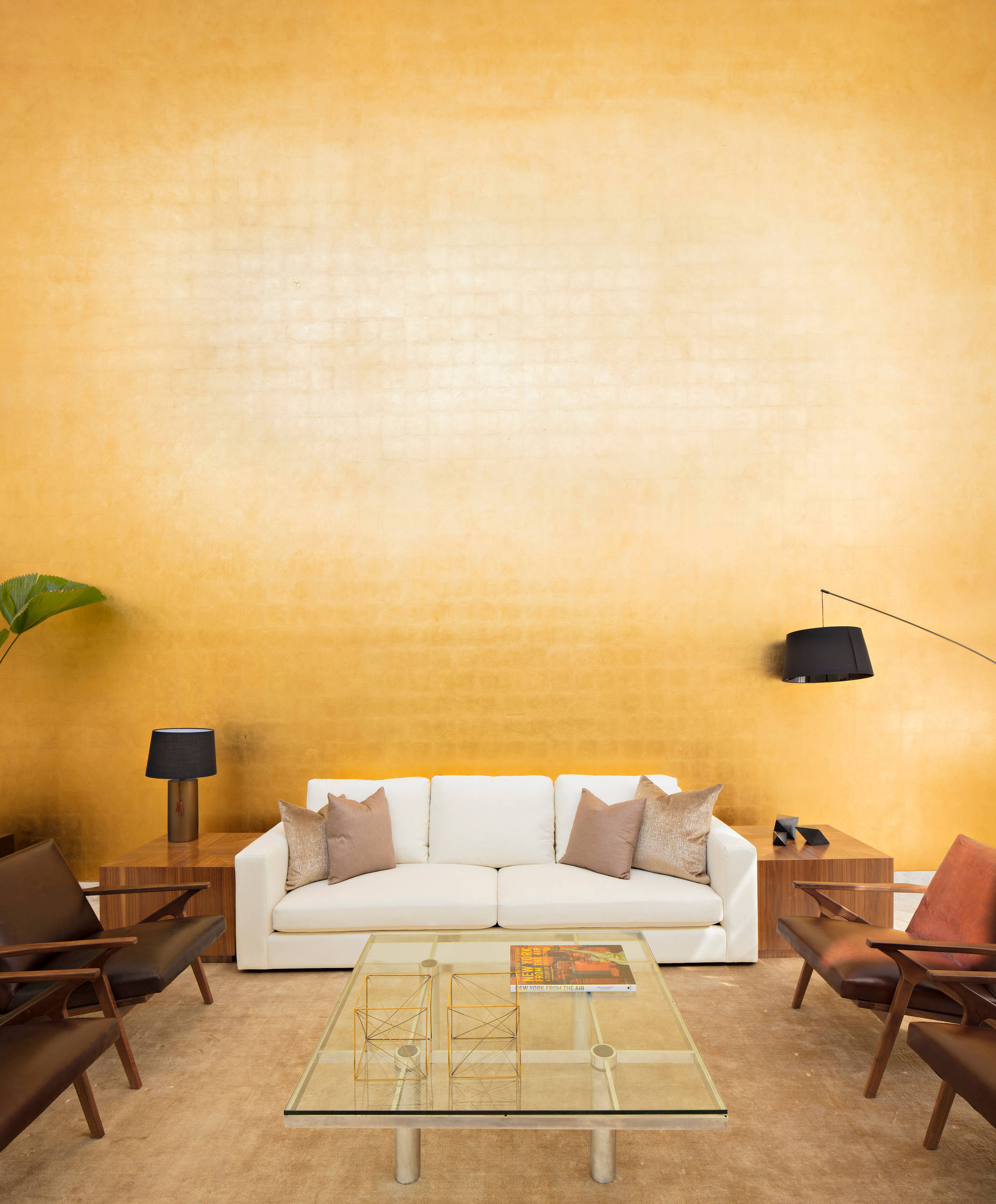 El muro principal, revestido de hoja de oro, captura la luz que entra del sur y la proyecta en un tono dorado hacia la planta baja y la azotea. Un recurso muy de Barragán.