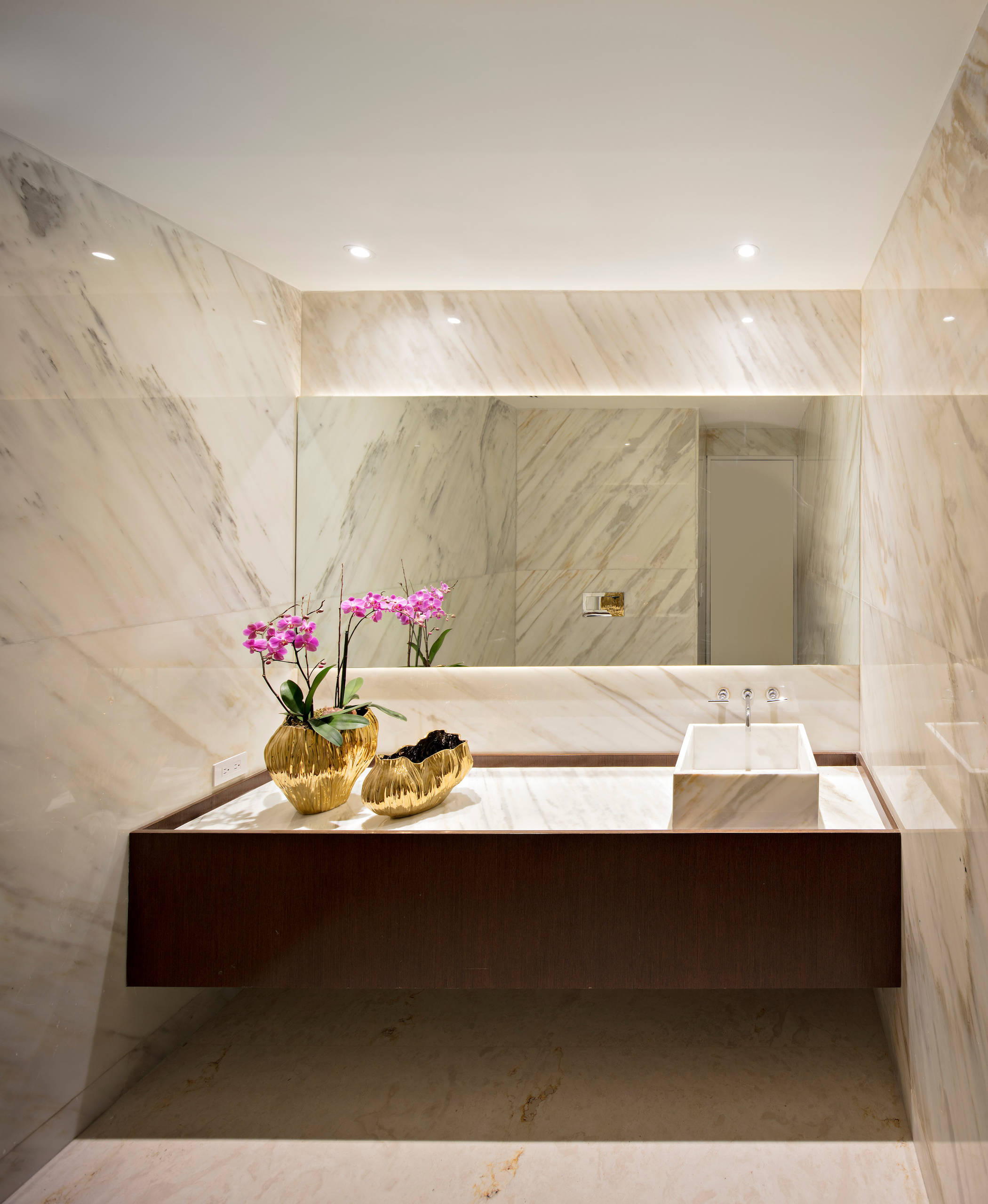 En el baño de visitas, el mármol blanco es el protagonista total del espacio. Su presencia es absoluta en la totalidad de los muros y el lavabo, únicamente interrumpida por los paneles de madera que delimitan la encimera y que generan un elegante contraste.