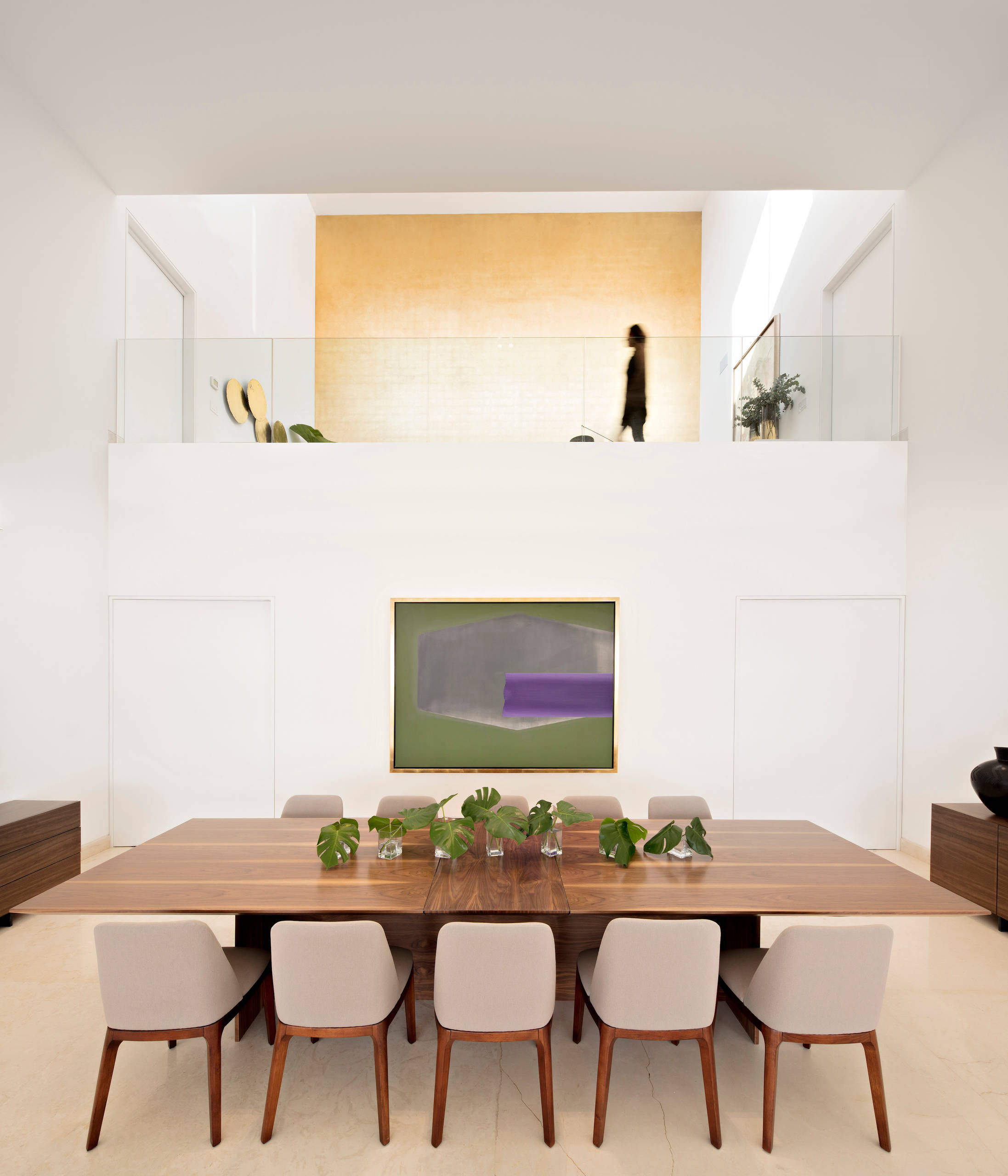 La simetría y conexión visual entre los espacios se hacen presentes particularmente en el área social, donde se observa una cuidadosa alineación con el mobiliario que enfatiza un juego de contrastes entre tonos y texturas.
