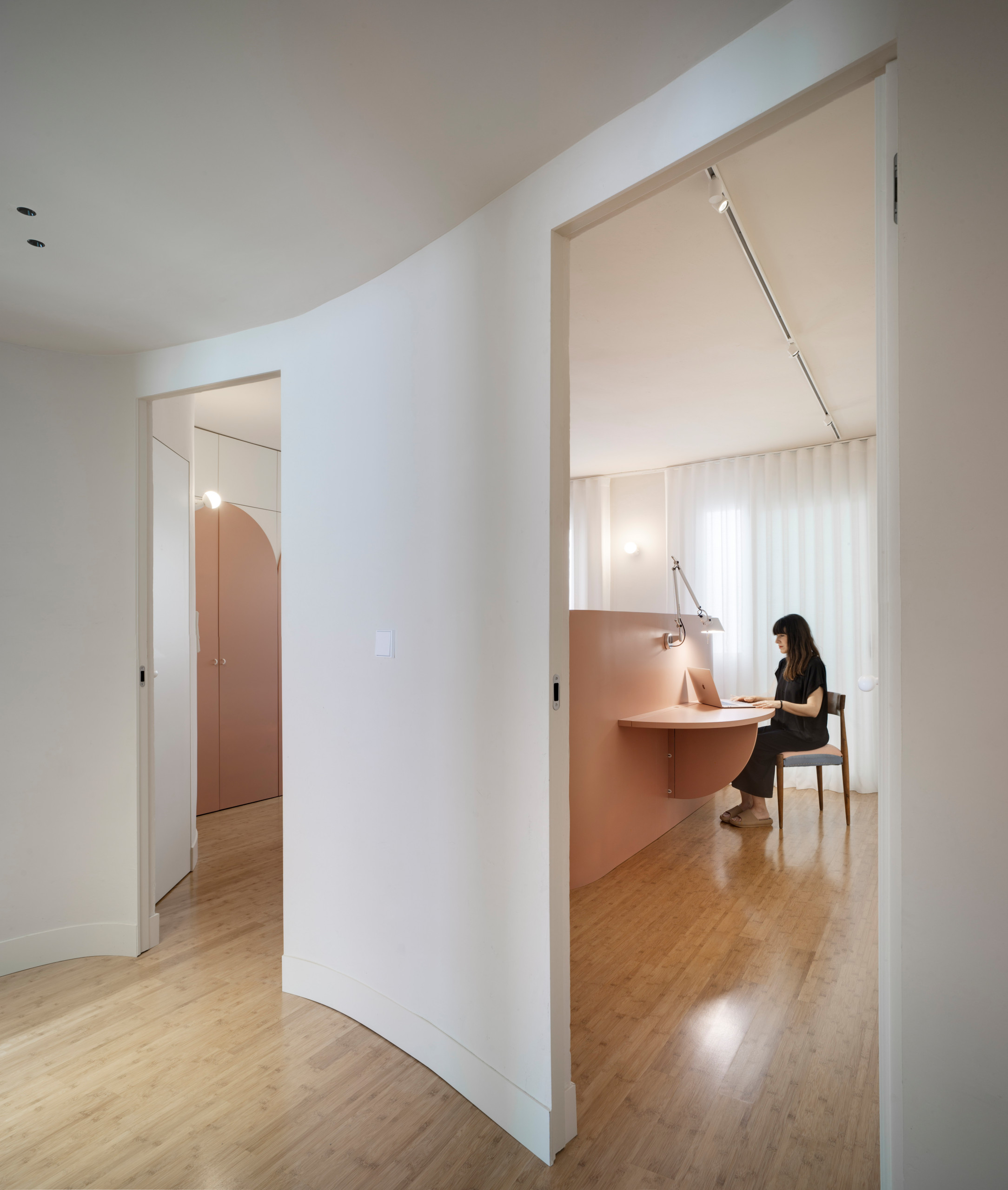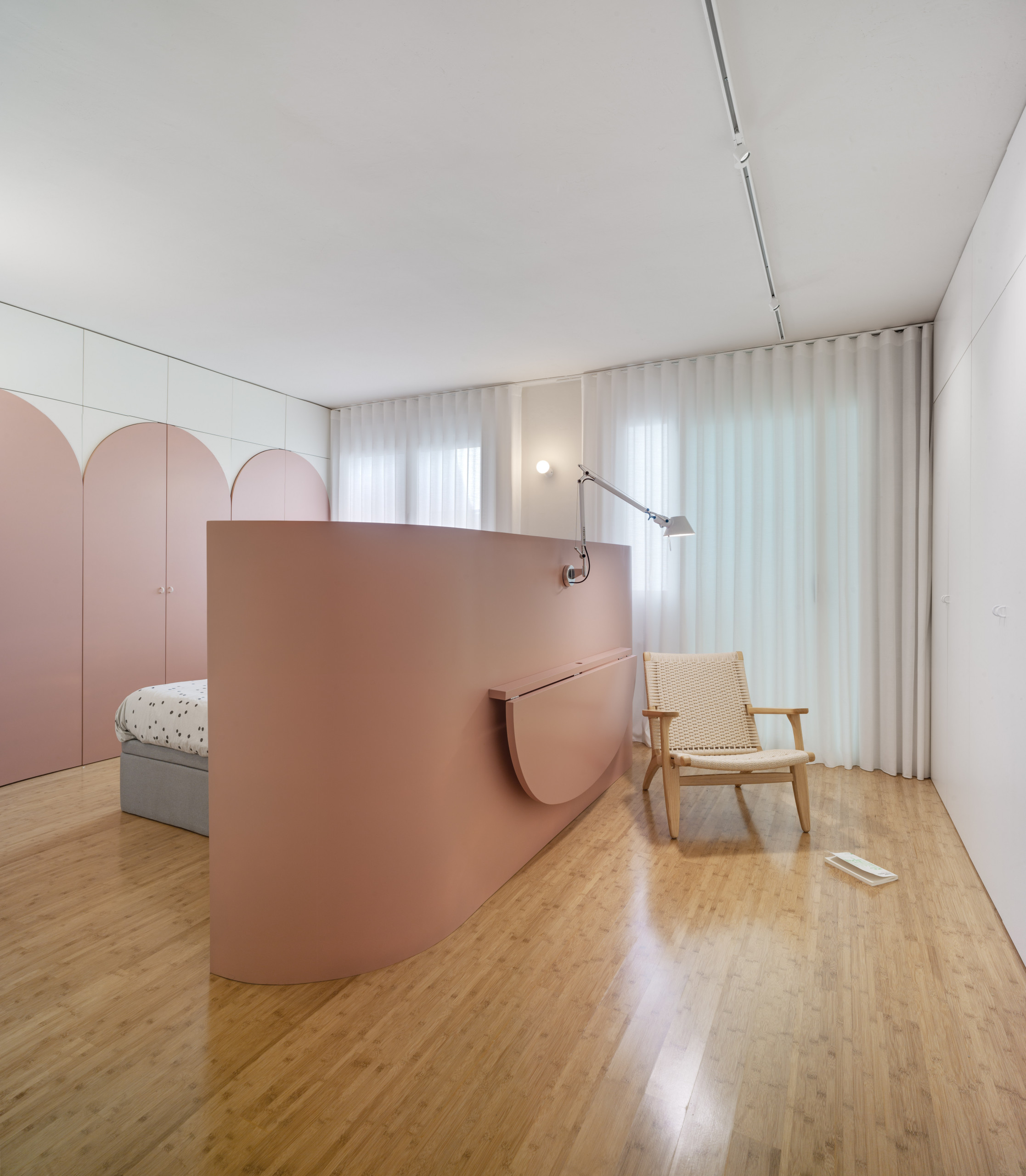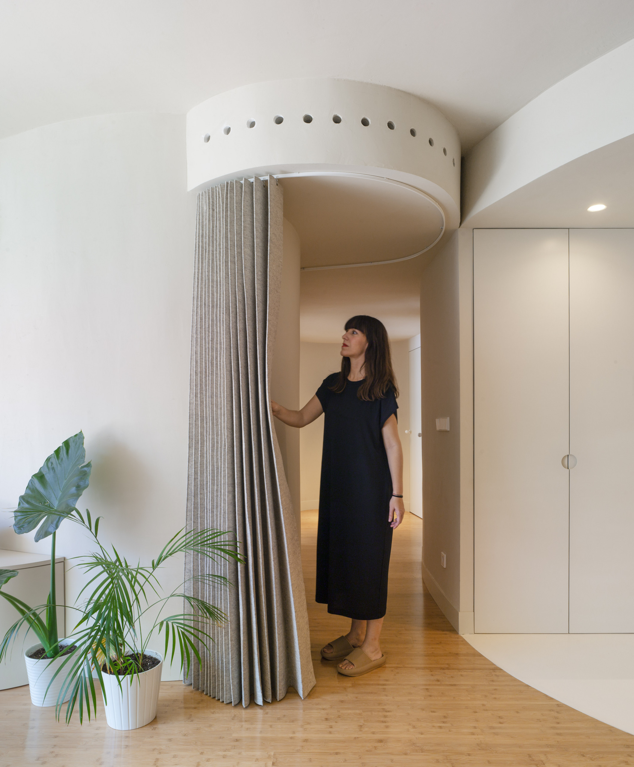 Otra cortina separa la zona de día de la de noche, dando paso al distribuidor de las habitaciones. El riel curvo permite distintos grados de apertura según la privacidad que desee.