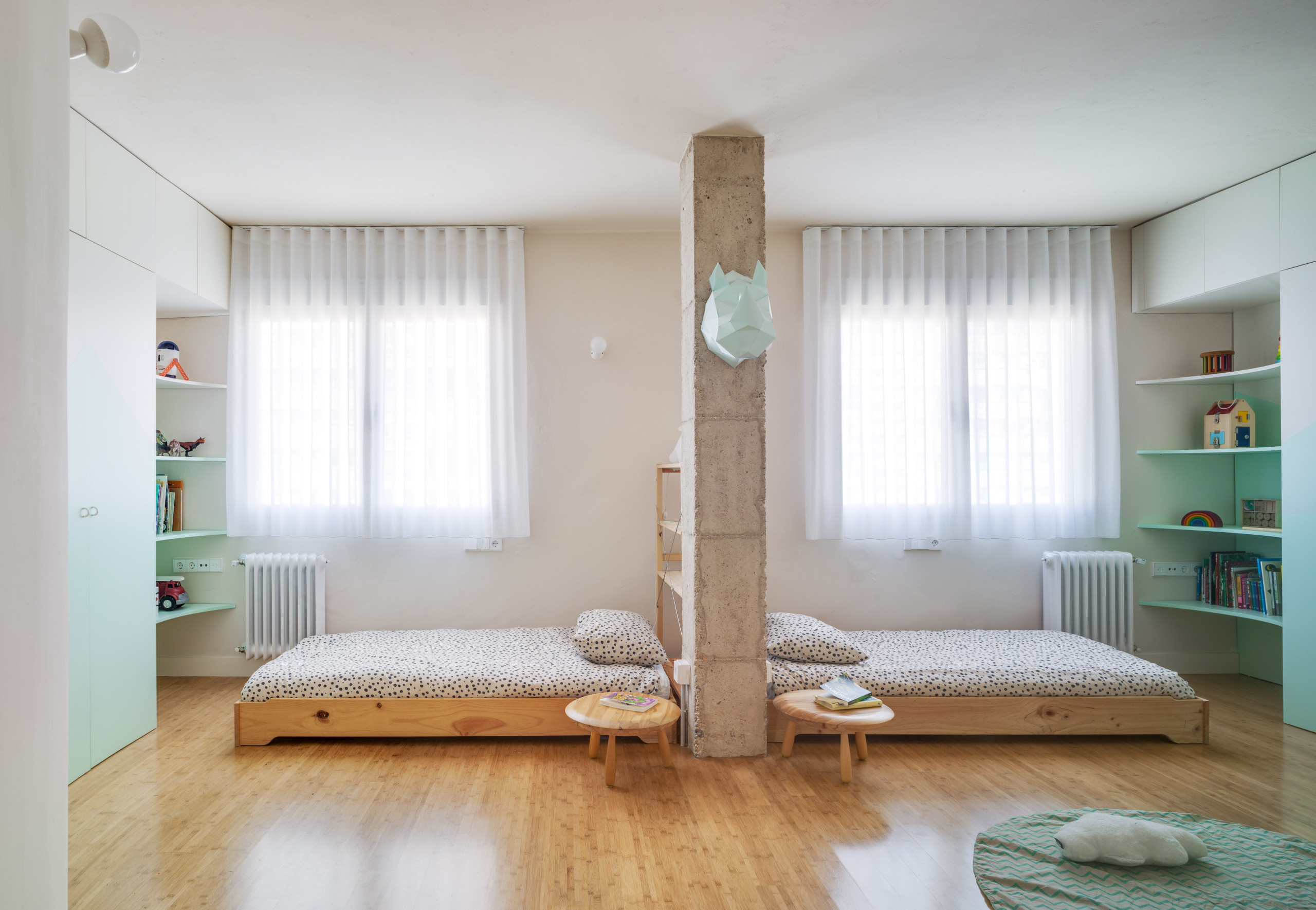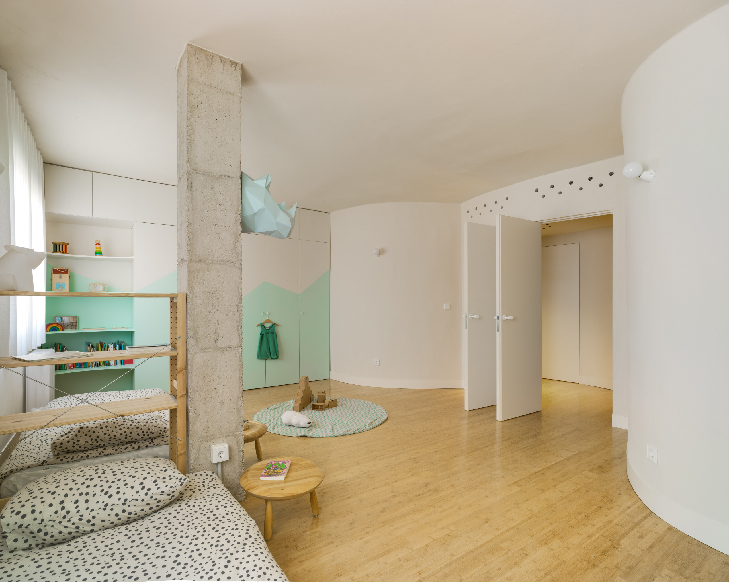 La habitación infantil se ha desarrollado bajo los criterios que acabamos de mencionar. Así, se ha creado un amplio y luminoso espacio que integra diferentes ambientes y se puede ir transformando según cambien las necesidades.