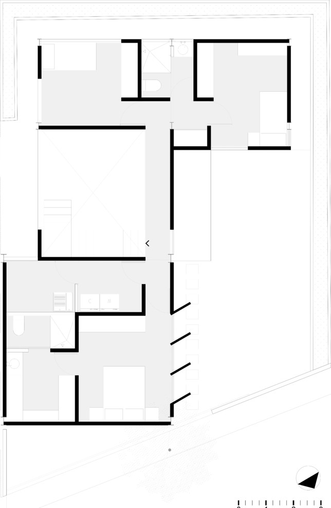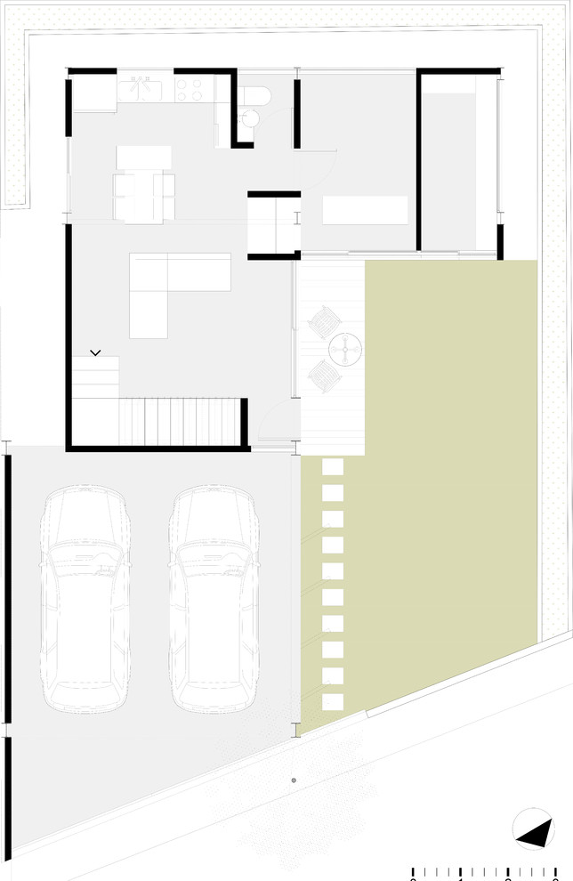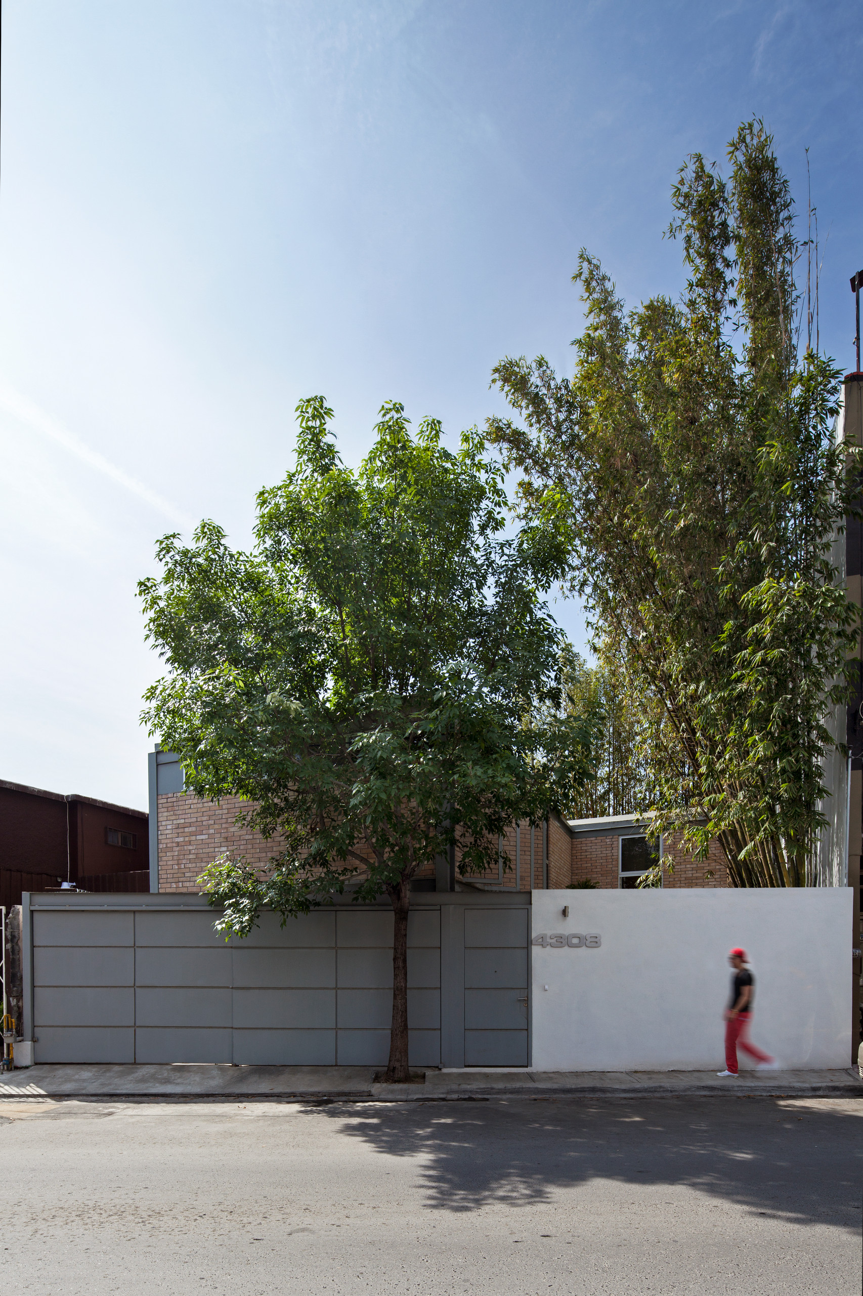 Al acercarse a la casa por el exterior, no es posible percibir la arquitectura de la vivienda en su conjunto gracias a un muro que preserva su diseño, ayudando al mismo tiempo a configurar estos espacios al aire libre.