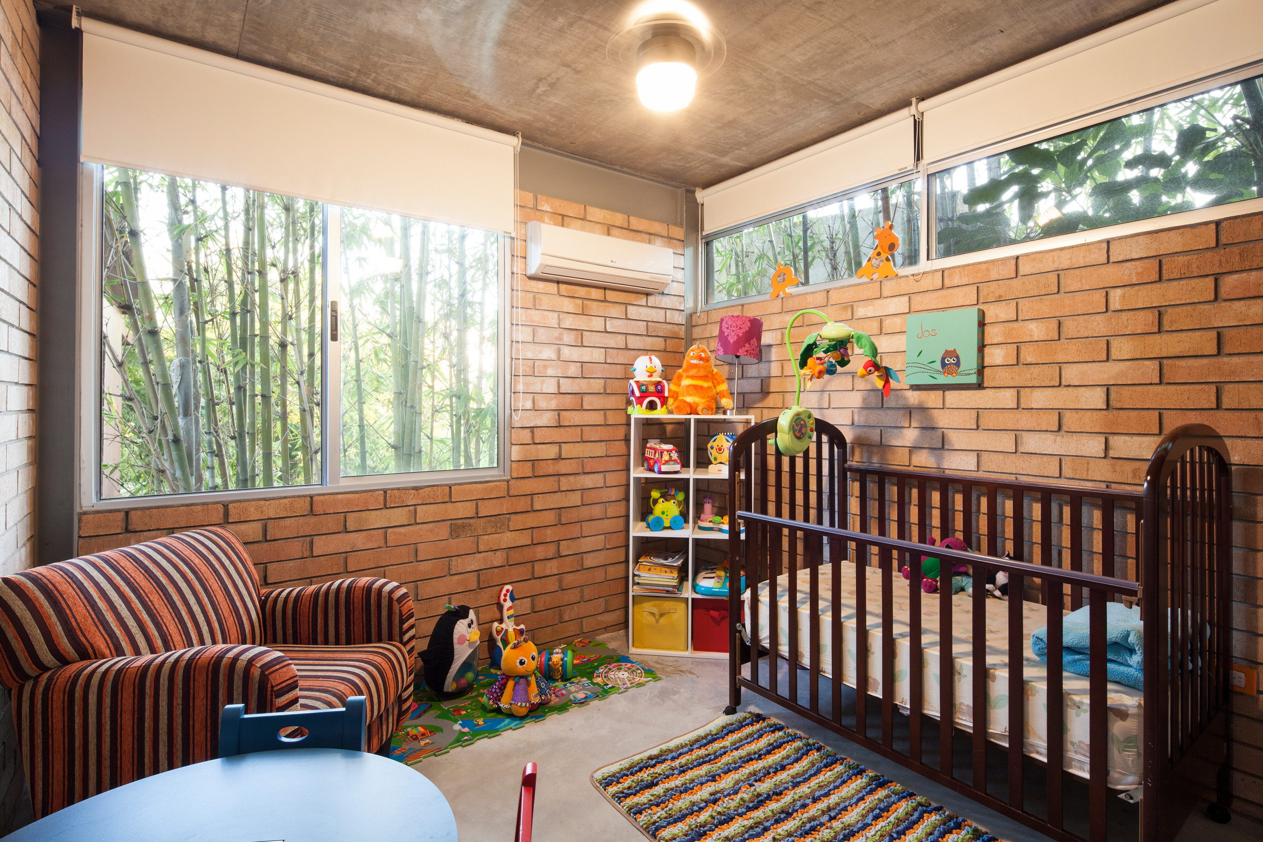 Las habitaciones de los hijos comparten un baño, al que se accede desde el pasillo. En esta imagen se aprecia especialmente cómo la conexión con el exterior transforma por completo la experiencia desde el interior, obteniendo las mejores vistas posibles a pesar de las circunstancias de partida de la parcela; un verdadero logro por parte de los arquitectos.