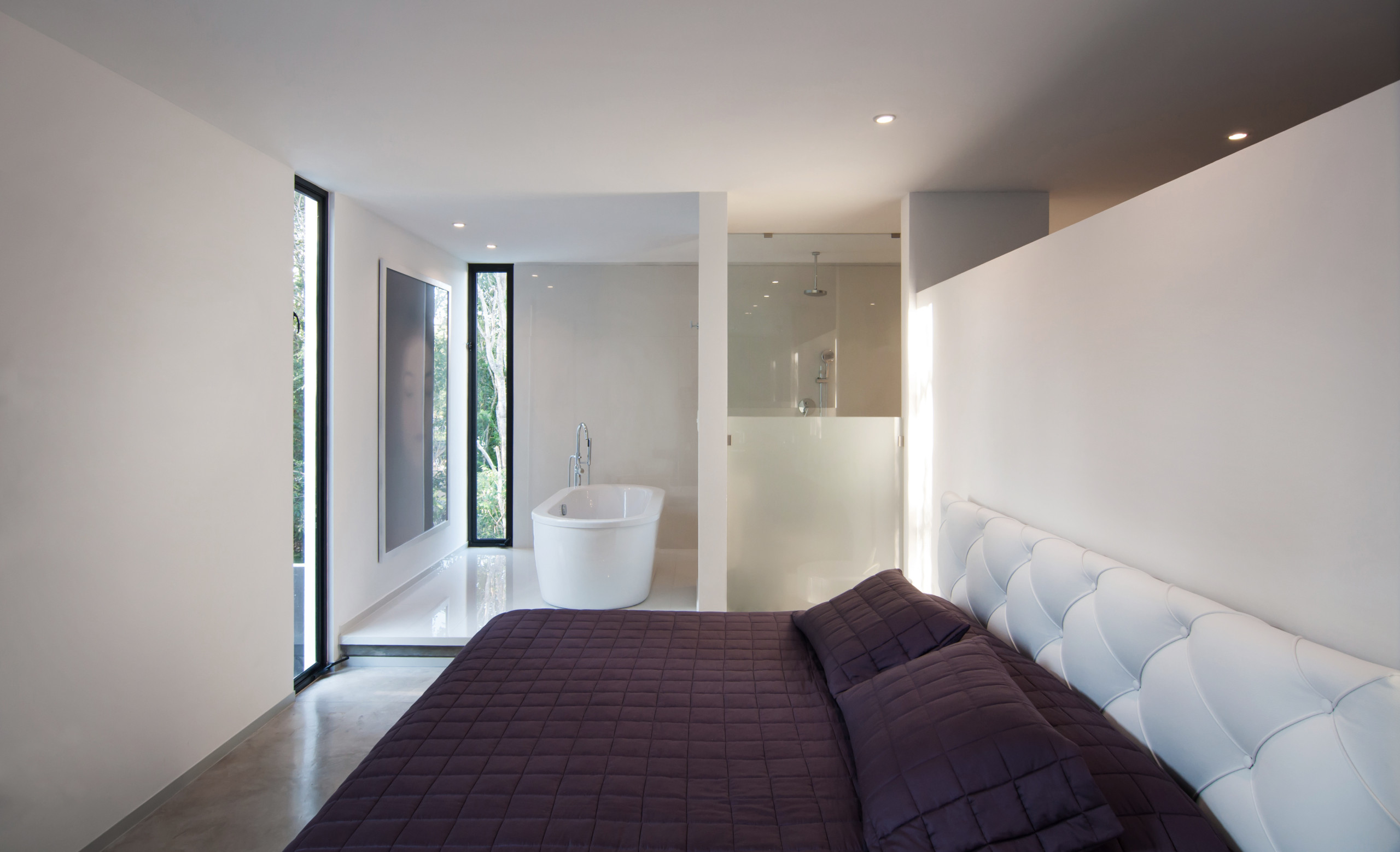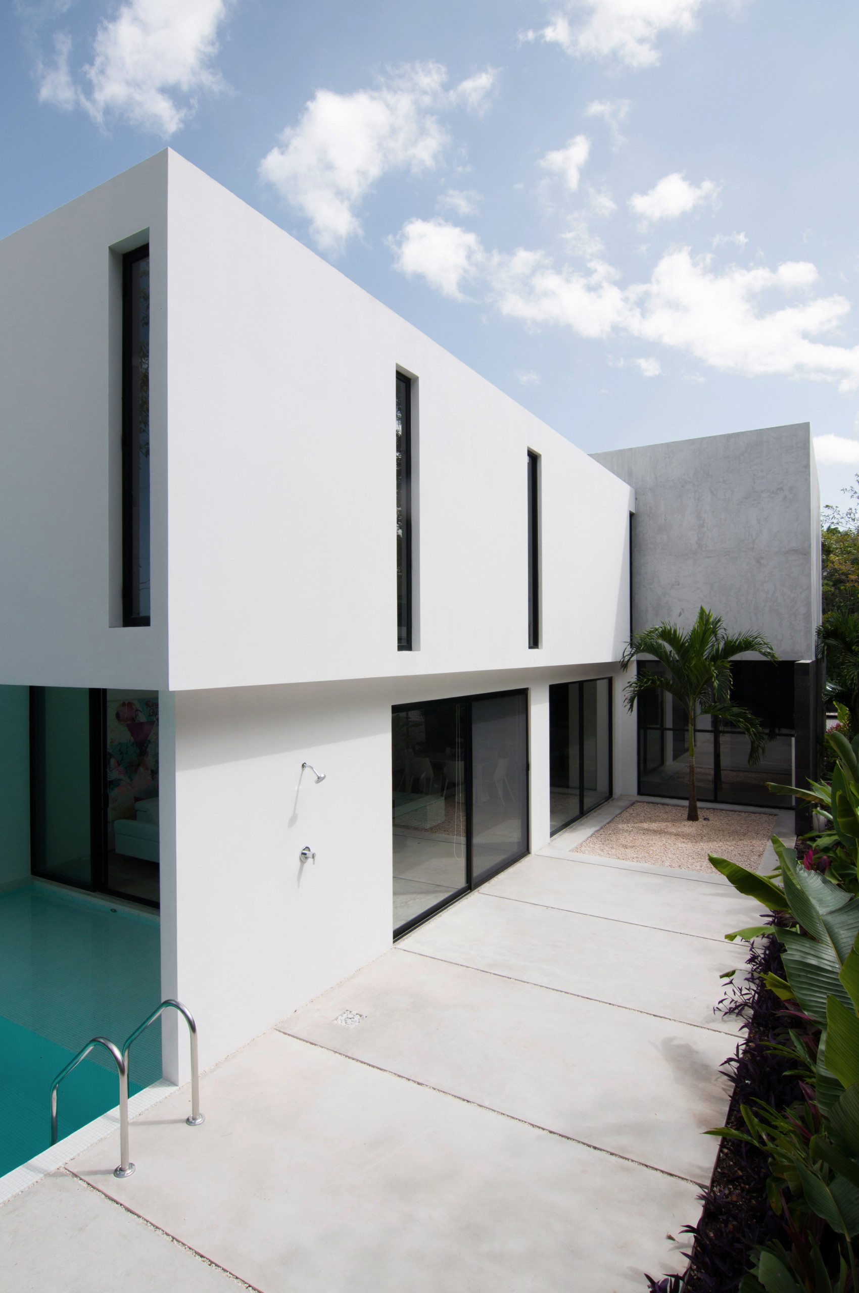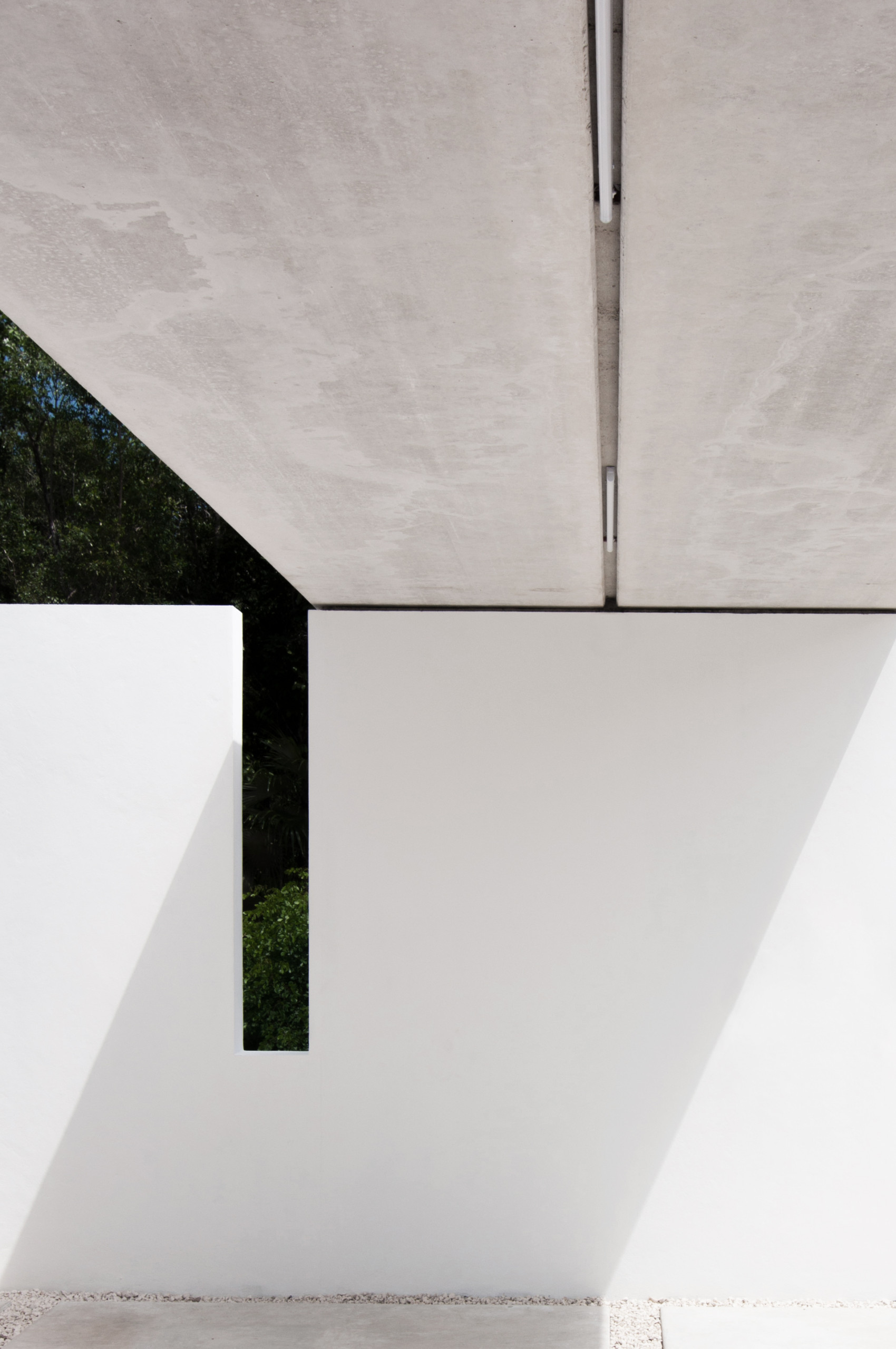 Para el volumen superior, la fachada se cierra estratégicamente protegiendo el interior del exceso de sol (la temperatura media anual en Cancún es de casi 26º C); las ventanas verticales puntuales dirigen las vistas para evitar que futuras construcciones puedan alterar la percepción del entorno.