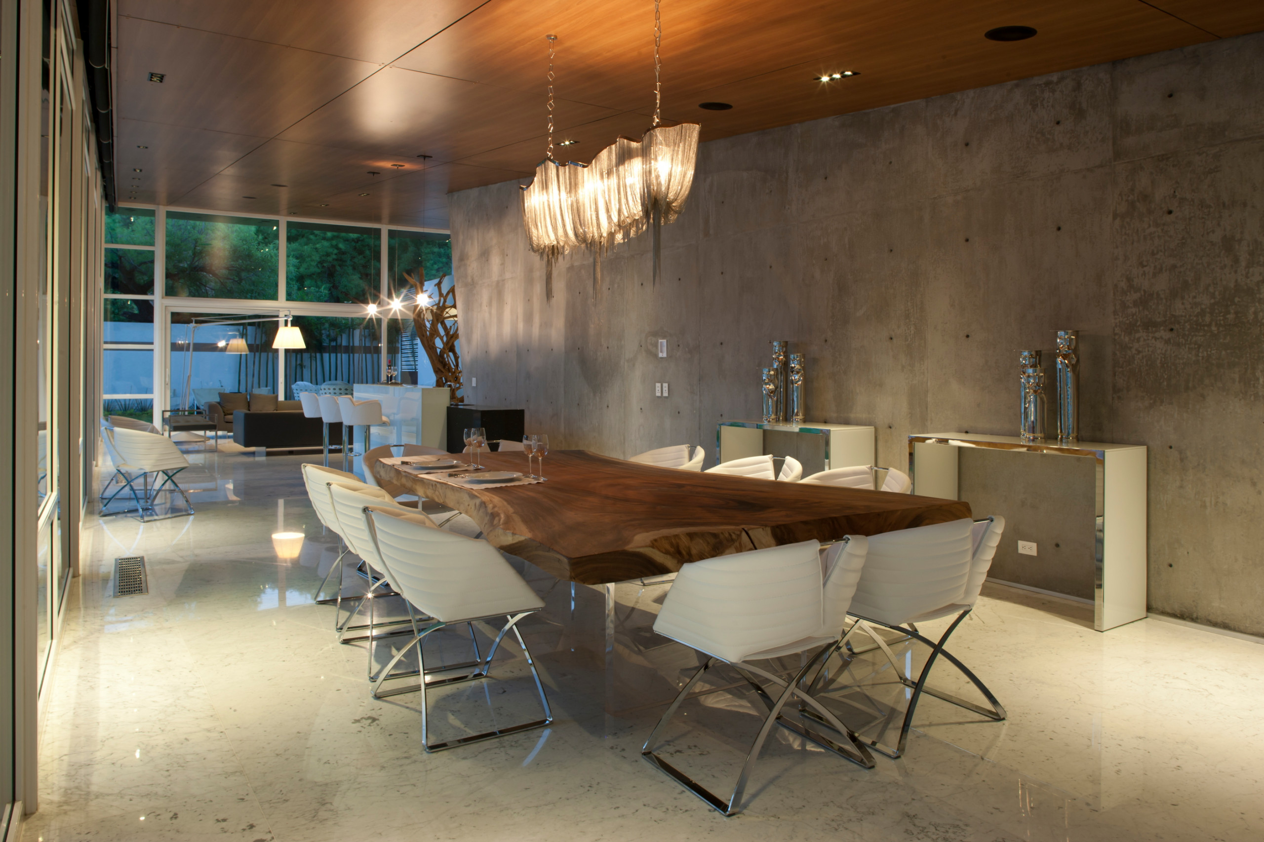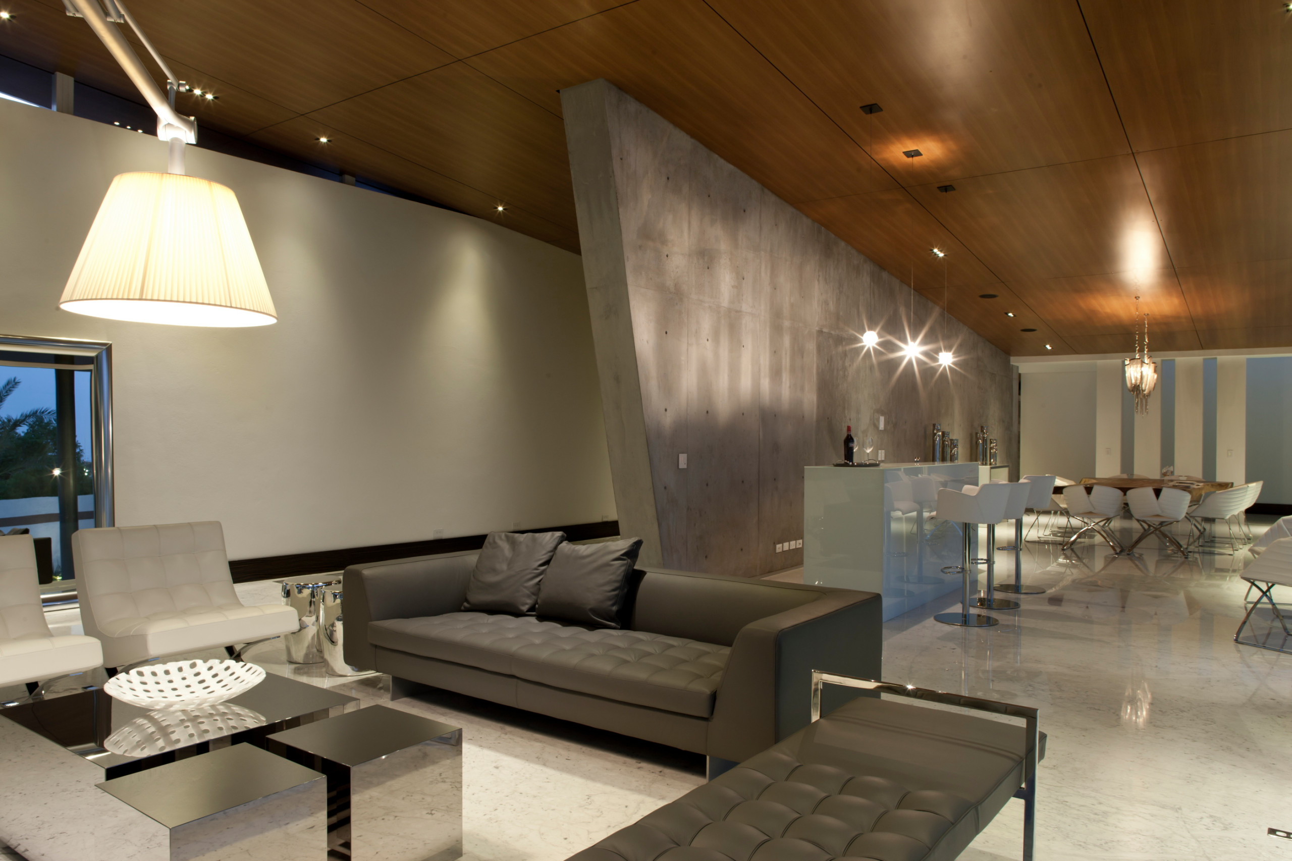 En el centro de esta zona, se construyó un muro de hormigón visto con una ligera inclinación que organiza el espacio interior, y que posteriormente se puede observar como una continuación en el mirador en el segundo nivel. Cada detalle decorativo fue cuidado con el objetivo de dar personalidad.