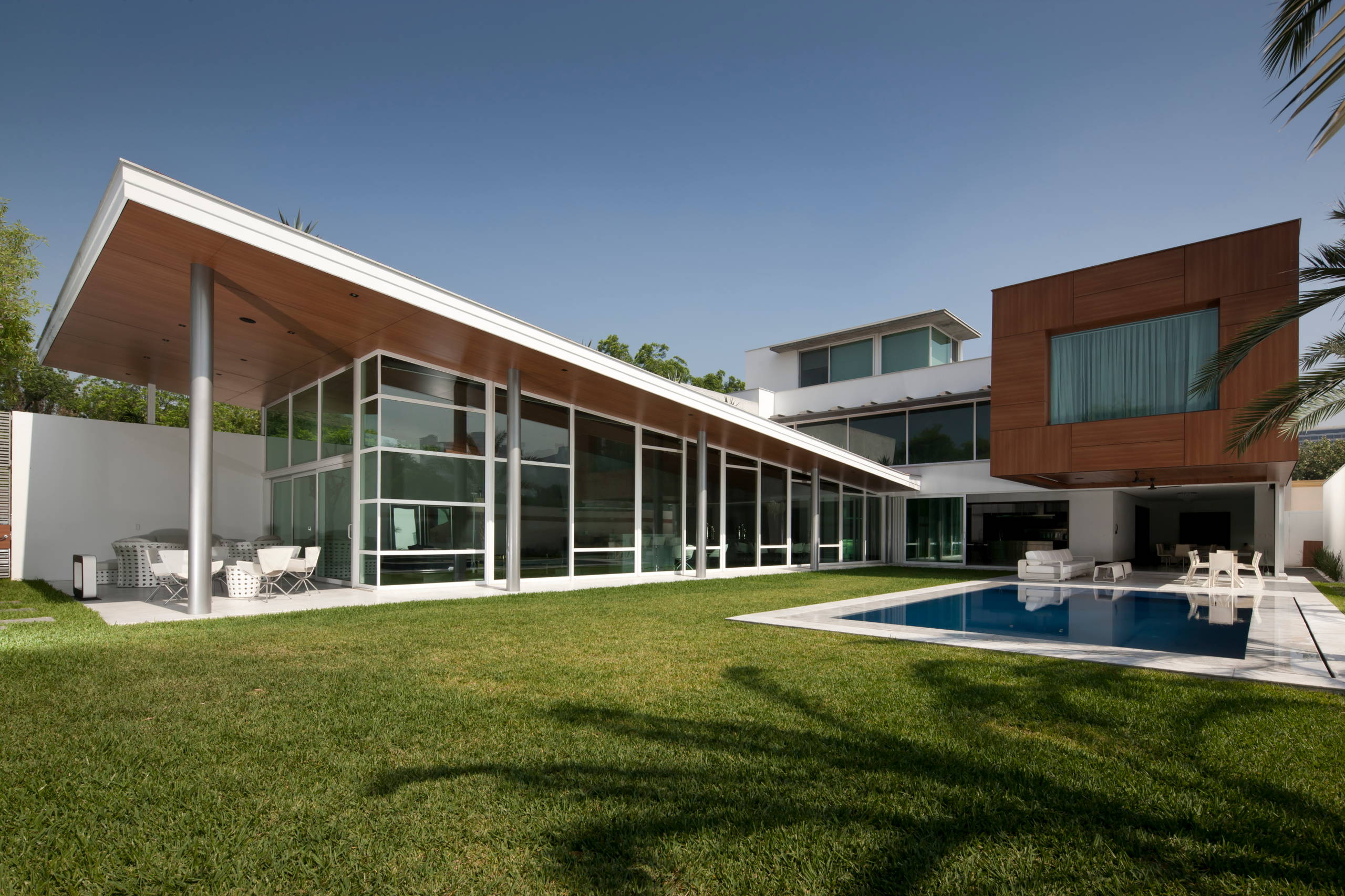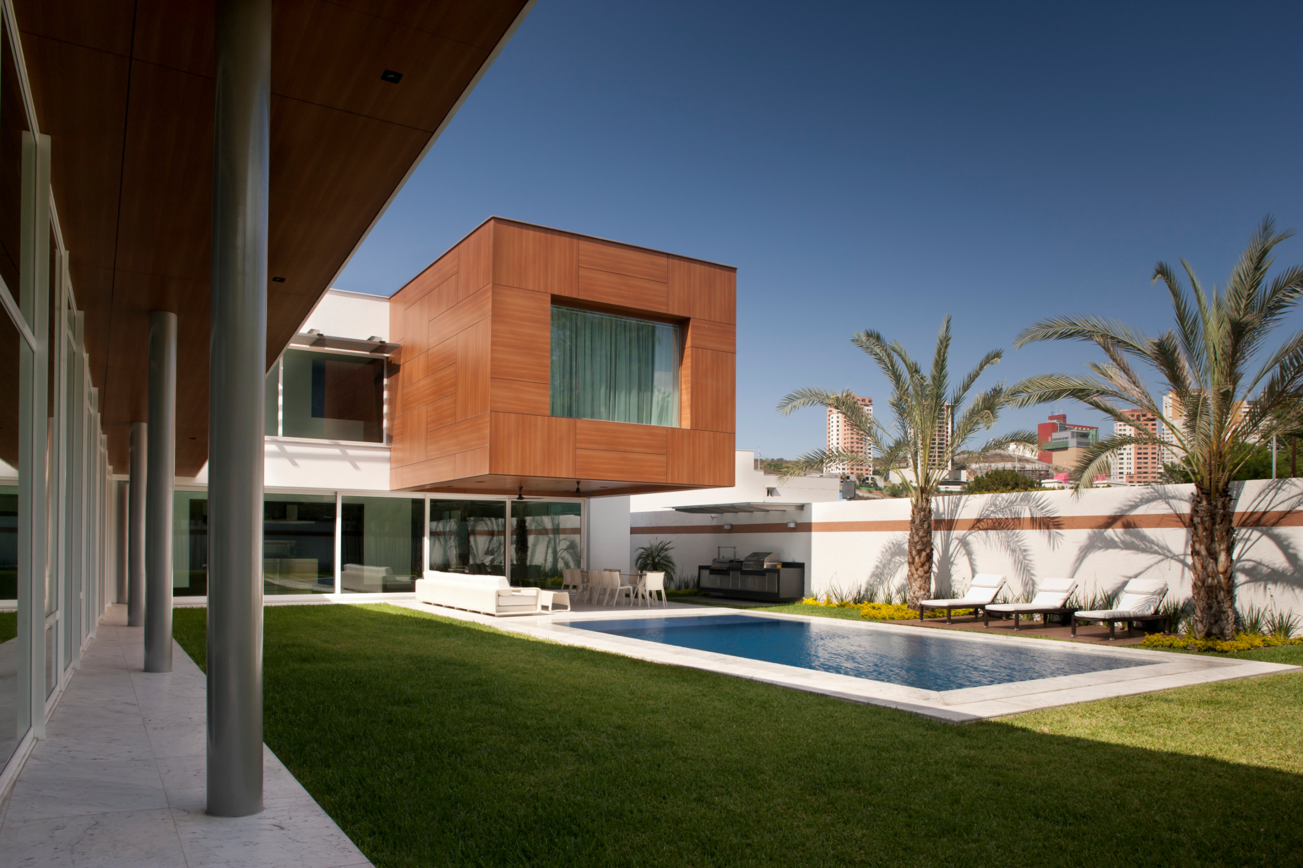 Por el exterior, la escuadra se enfatizó mediante dos grandes muros que atraviesan la casa de lado a lado. Estos muros además de definir los espacios, separan las áreas de circulación del resto de la vivienda.