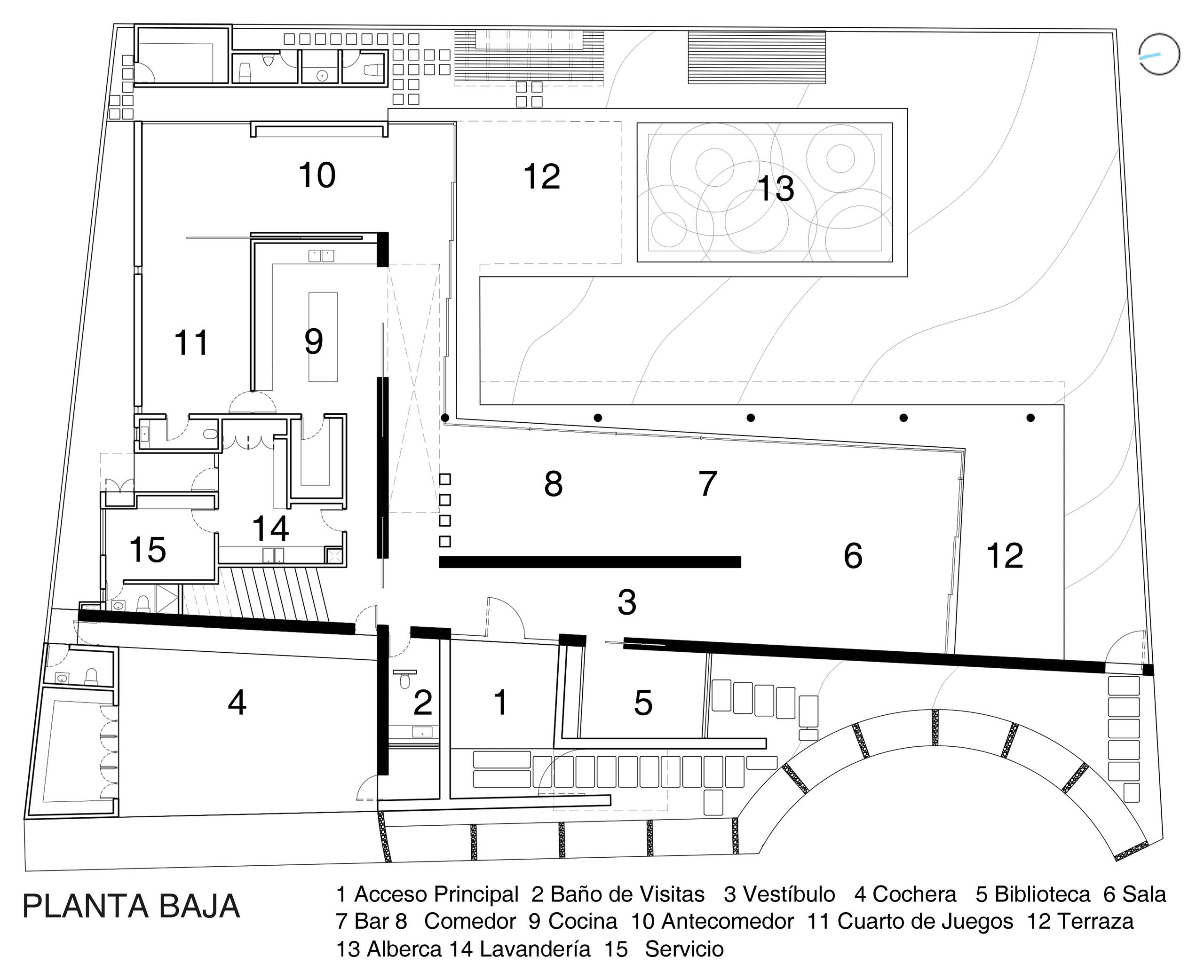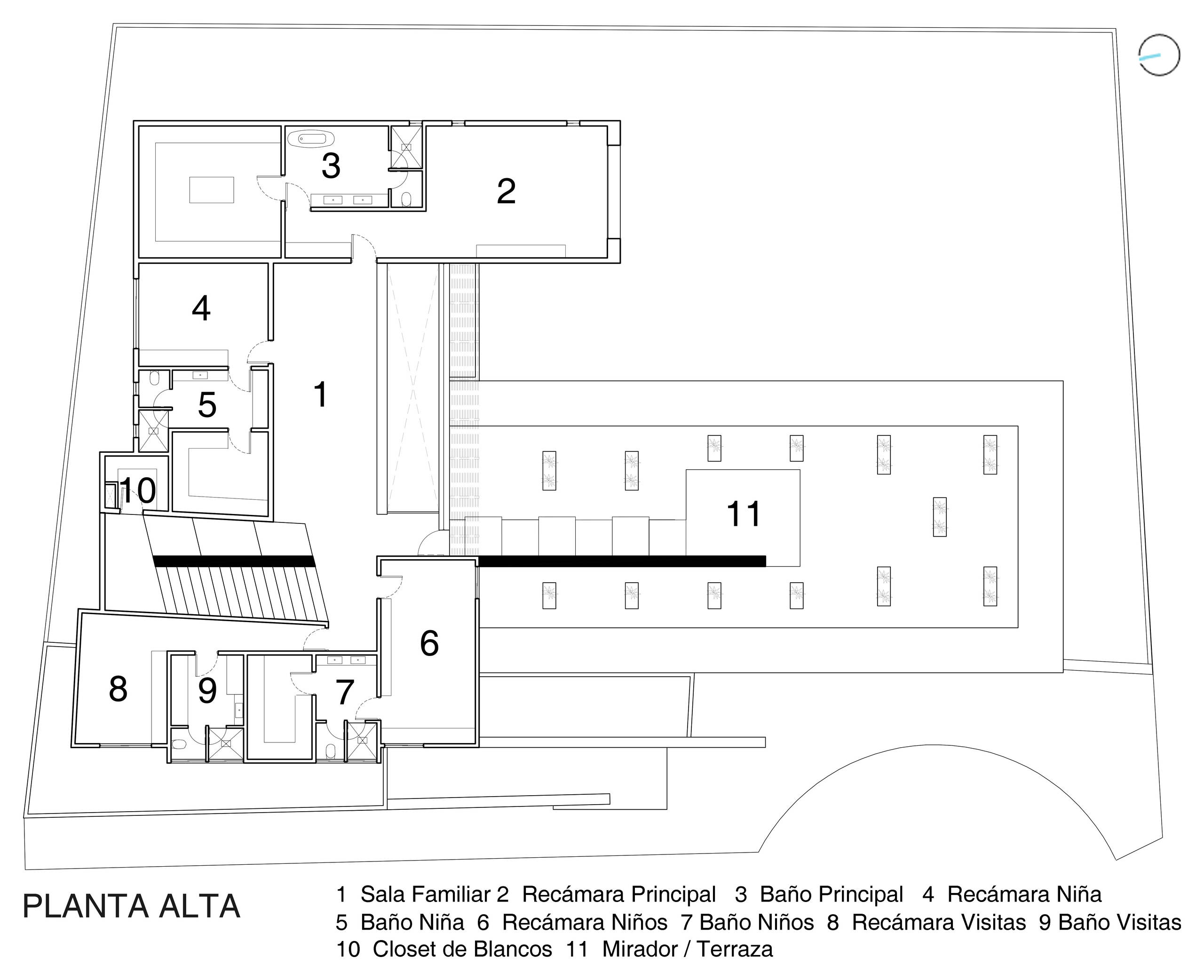 Para lograr esa capacidad de transformación y adaptabilidad que pedían los clientes y que remarca Rodrigo, se propuso desde inicio una casa en forma de escuadra que pudiera abrirse en su totalidad hacia el interior de la propiedad, tal y como se ve en el plano de la imagen.
