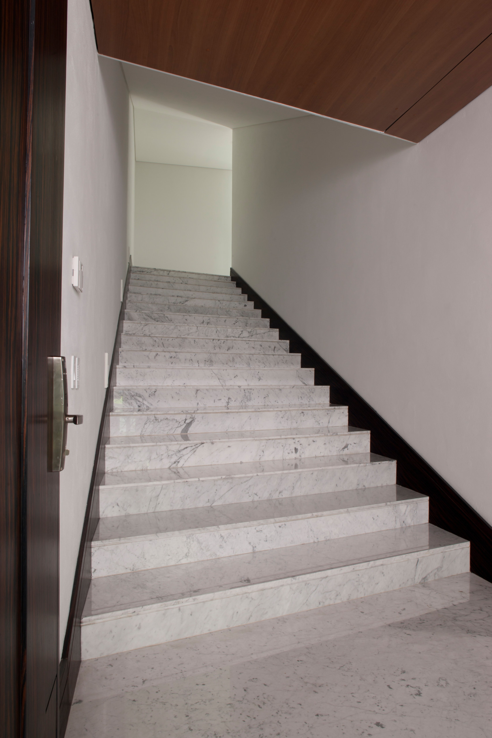La escalera siempre es un motivo recurrente en los proyectos del mexicano Rodrigo de la Peña. Para el de Casa Santa Engracia, el arquitecto optó por una asimétrica recubierta de mármol, donde la segunda rampa está dibujada con escalones pequeños y con más profundidad, jugando con la percepción del que la usa.