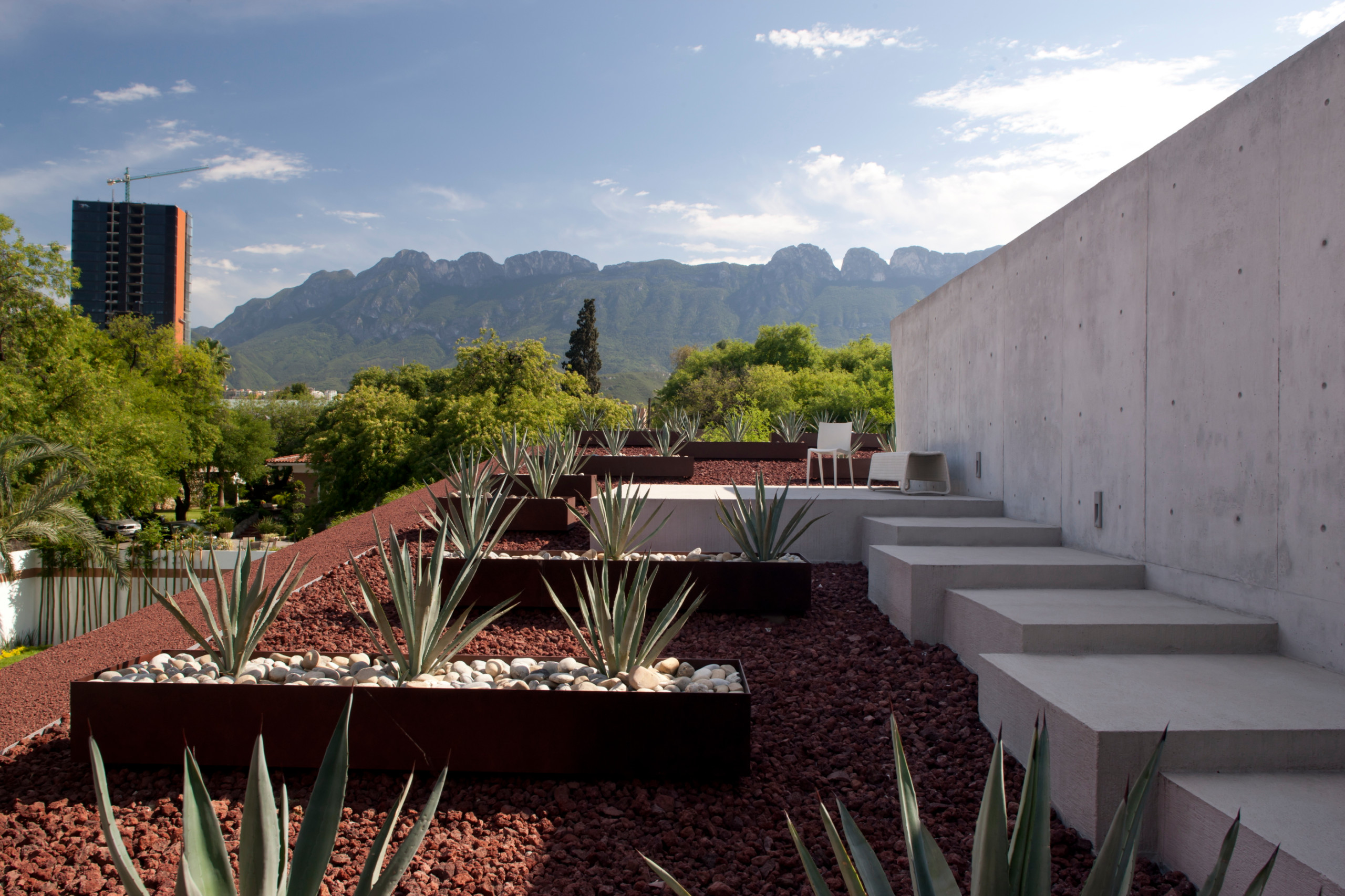 En las azotea se emplearon jardineras con plantas regionales sobre una cama de piedra volcánica, que minimiza también el contacto solar. Desde el principio se tenía claro que era necesario utilizar al máximo la superficie de esta losa, ofreciendo un espacio de contemplación y relajación. “El mirador es uno de los lugares más importantes de la casa, todos los días son únicos en él, mirando hacia la Sierra Madre”, comenta el responsable de la vivienda.