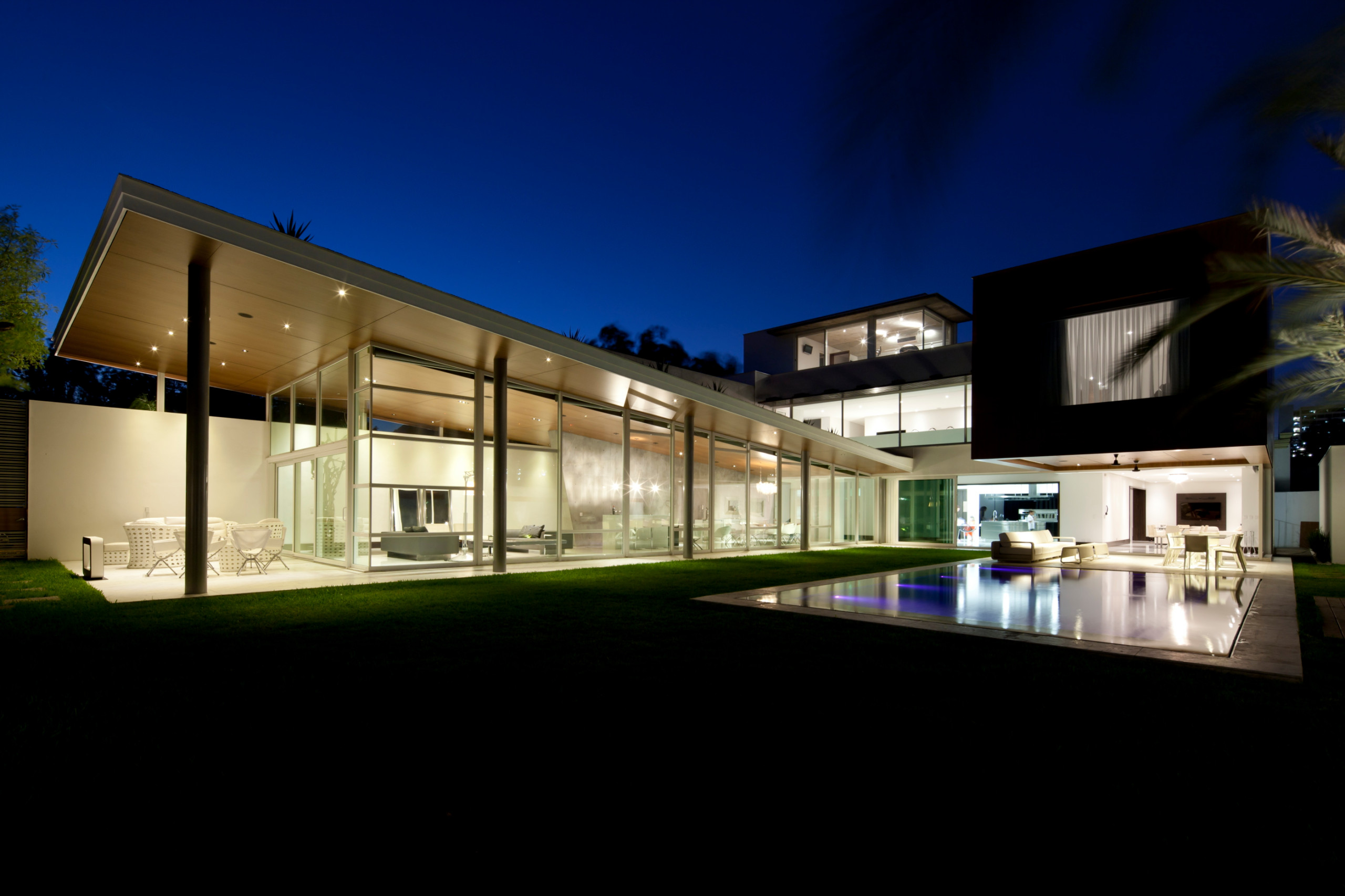 El volumen del dormitorio principal se diseñó como un elemento suspendido con un volado de 13 metros, estructurado gracias a una armadura de acero oculta, logrando impactar visualmente y, a la vez, techar parte de la terraza.