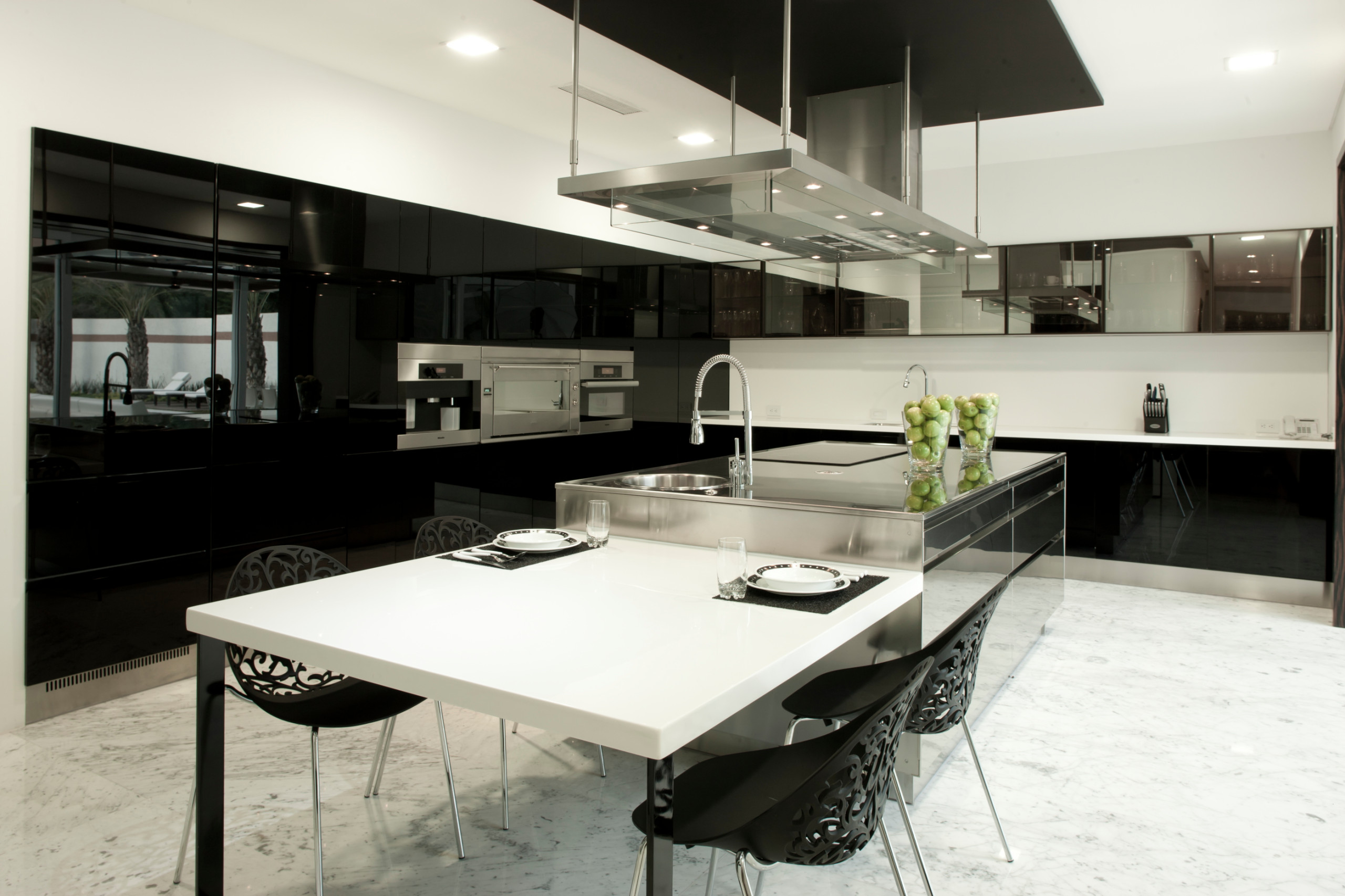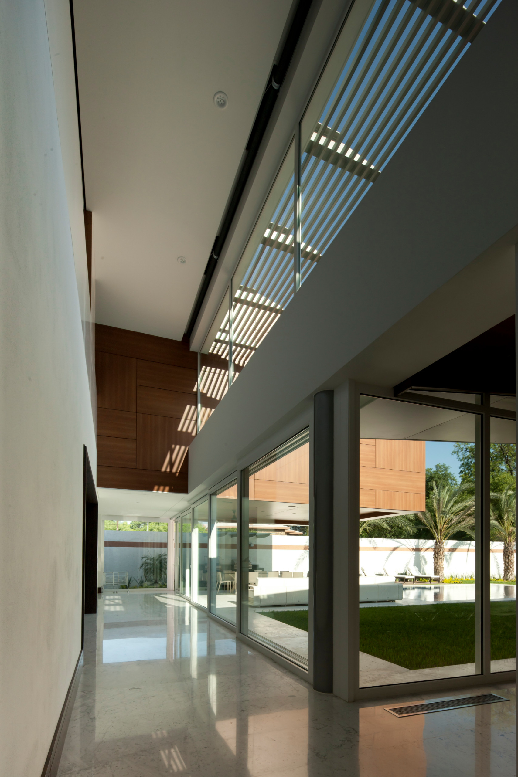 El suelo es de un mármol en tono claro que visualmente permite mantener la continuidad espacial y acentuar los espacios de circulación en la residencia. El pasillo principal conduce hacia el área social, cocina, comedor y, claro, hasta el exterior. En este corredor, los habitantes disfrutan de la luz y de la sombra que se proyecta por una pérgola en el segundo nivel.