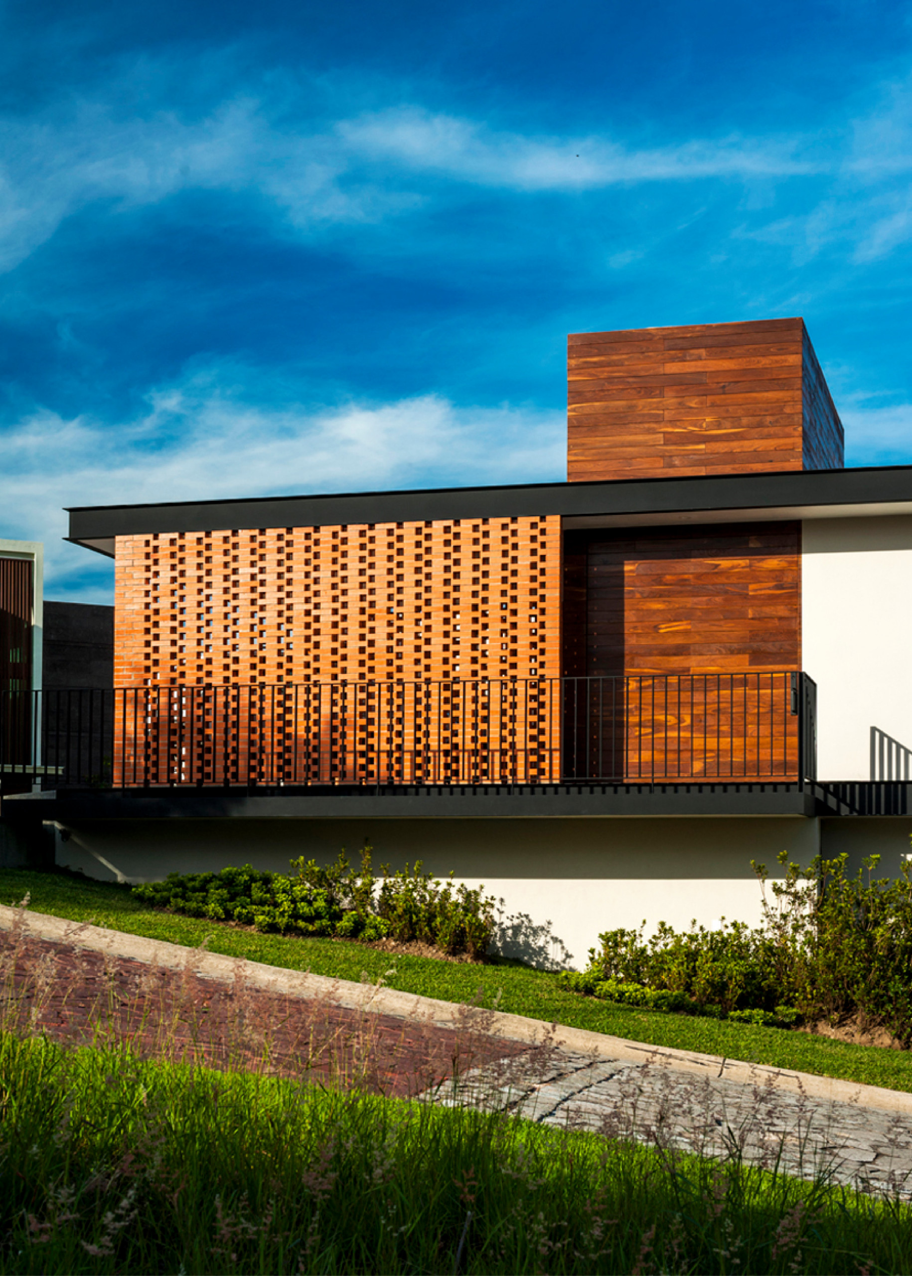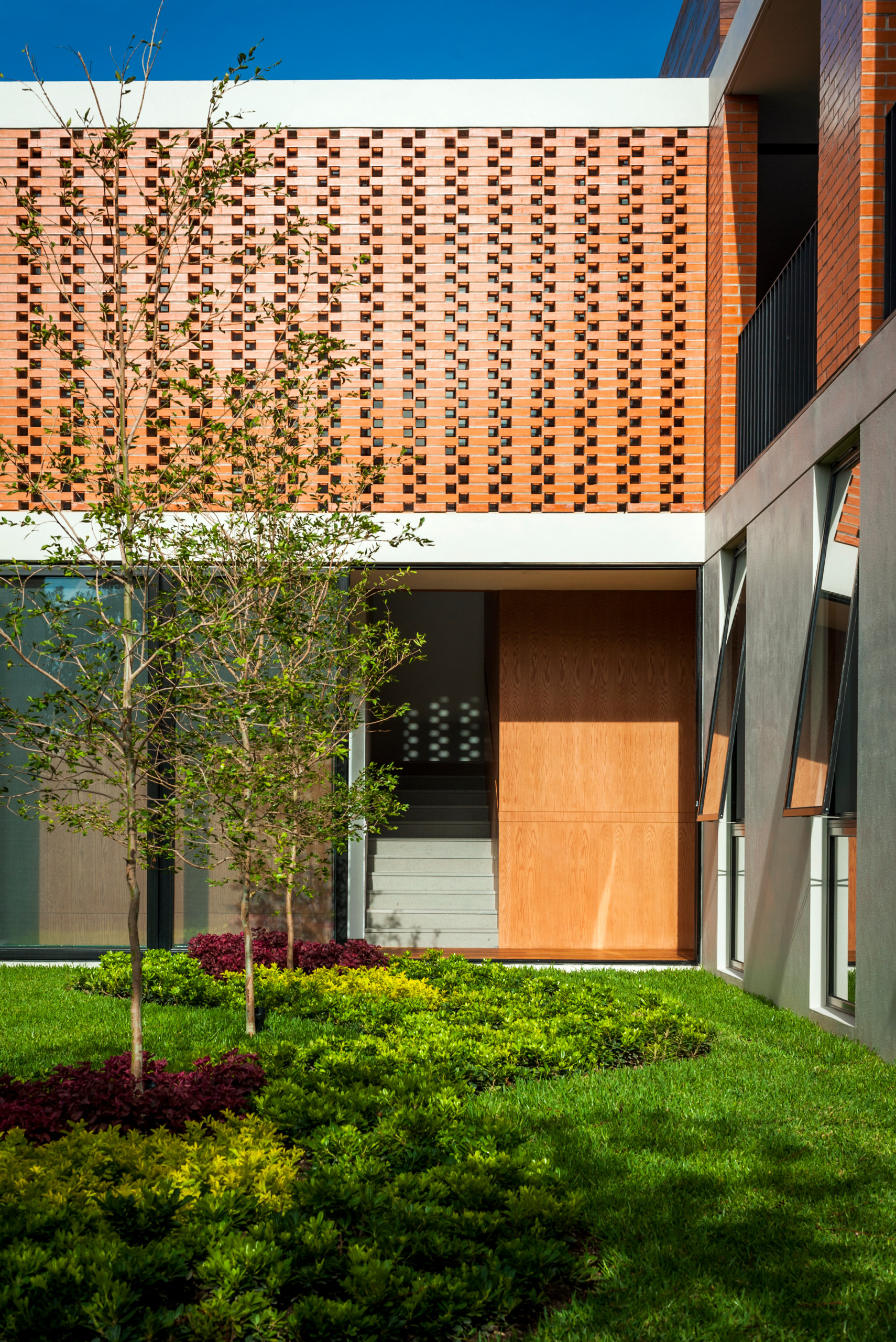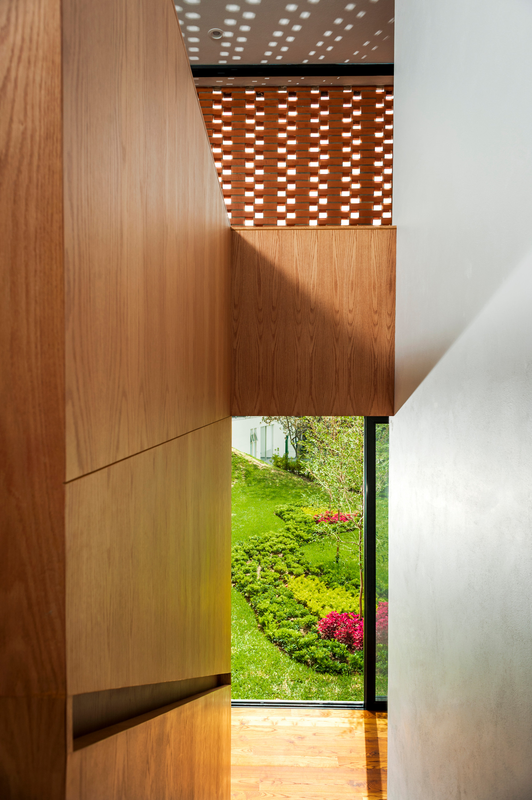 Mediante el uso de ladrillo expuesto se fue definiendo el carácter de todo el espacio interior, creando una clara distinción entre el exterior y el interior. De la misma manera, el uso de celosías genera jardines únicos y juegos de luces y sombras que definen una experiencia que enriquece el recorrido espacial, así como visuales cuidadosamente enmarcadas que generan distintas miradas hacia el exterior. Los detalles técnicos para el uso del ladrillo expuesto y la creación de estas celosías fueron un gran reto, ya que todos los muros son de carga y no hay ningún elemento estructural visible.