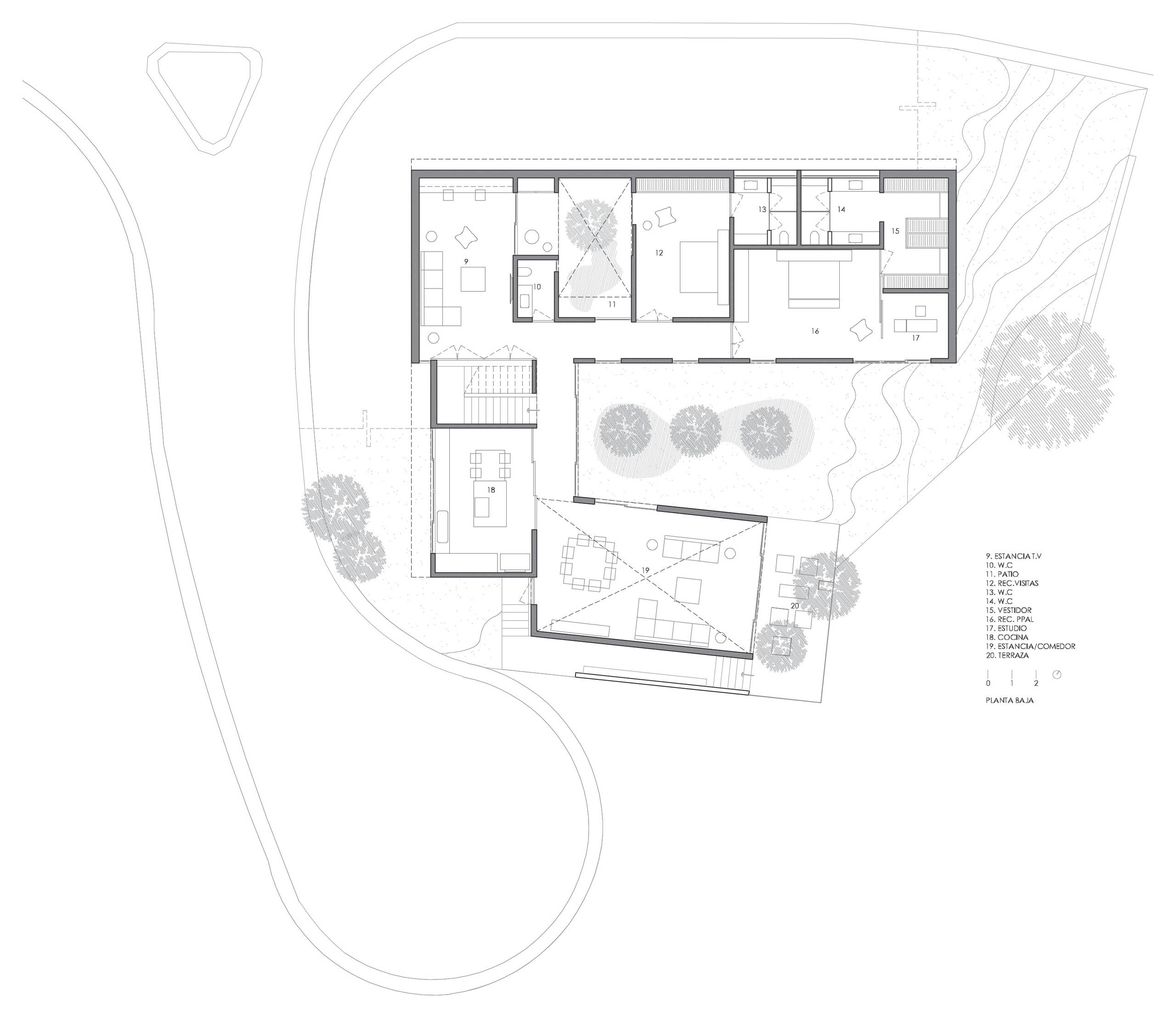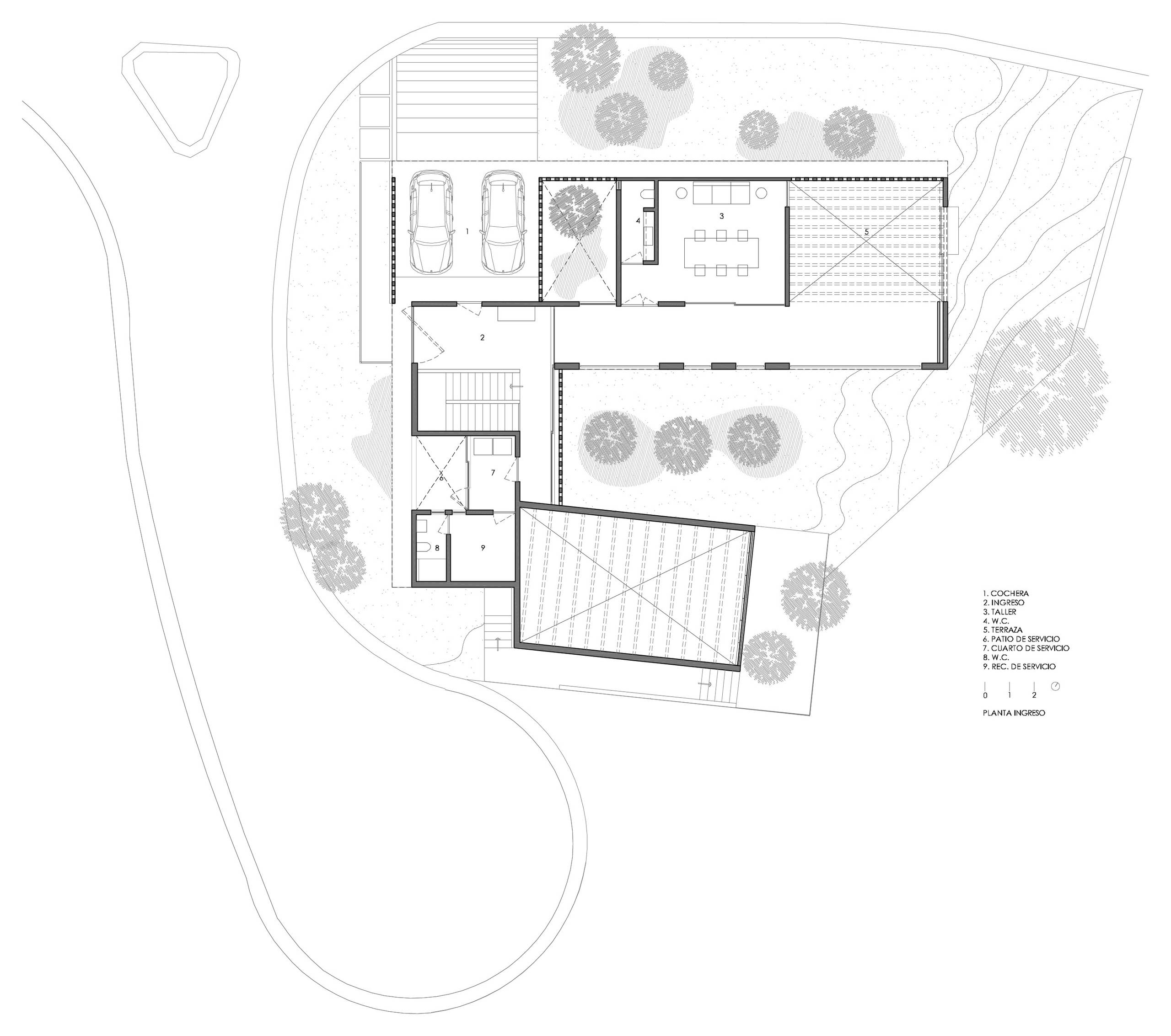 El terreno y su relación con el contexto inmediato al borde de una cañada permiten generar una distribución interna donde existe una separación clara entre las áreas públicas y privadas, alrededor del patio y según la planta.