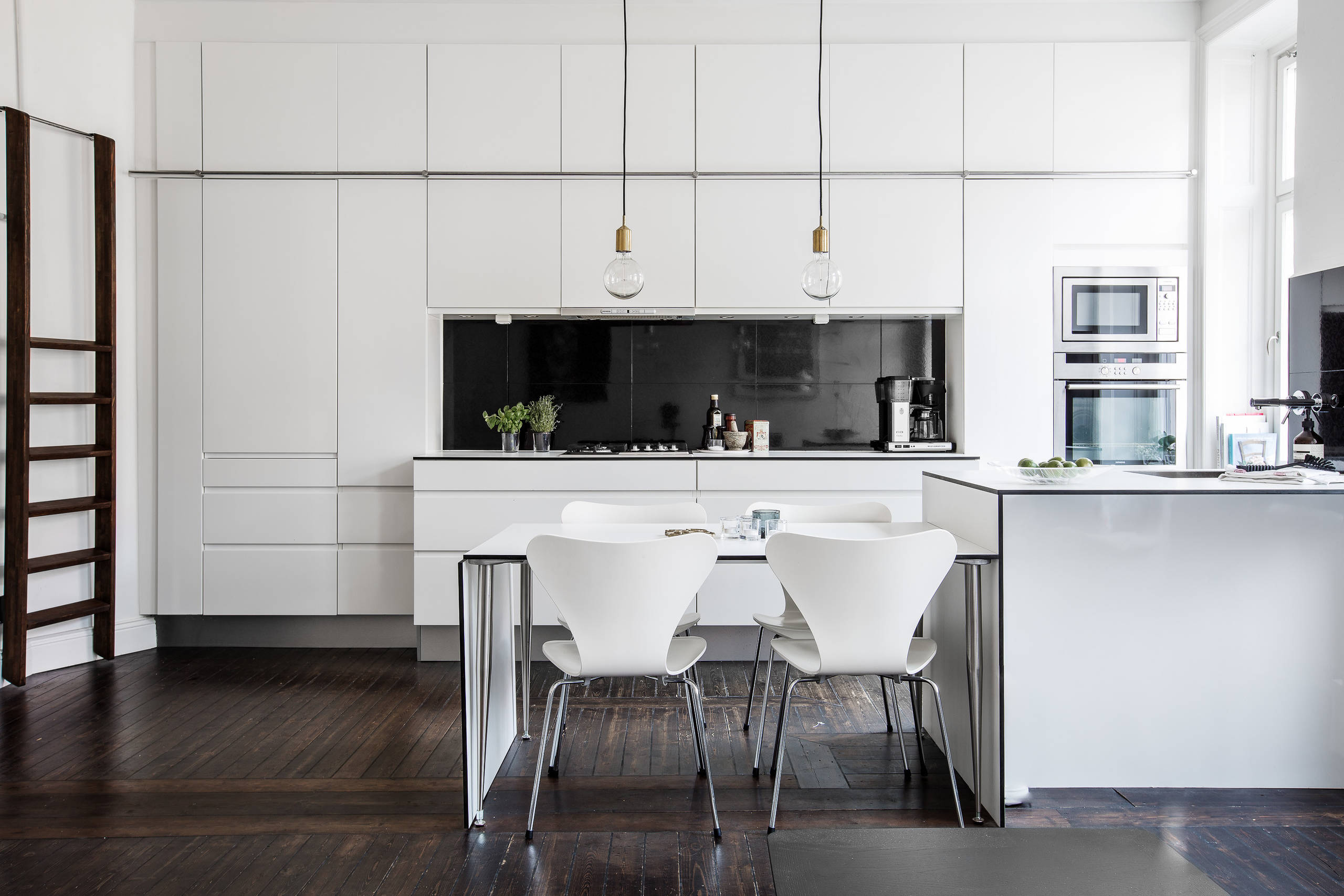 Blanca para una cocina con una base minimalista. En este caso, encontramos cuatro Series 7 amueblando una zona de office dentro de una cocina muy contemporánea. El blanco total de todo su equipamiento se ha roto únicamente con la madera oscura del suelo, que realza la luminosidad del espacio. Nadie diría que esta silla fue diseñada hace más de seis décadas, ya que encaja a la perfección en ambientes y decoraciones actuales.