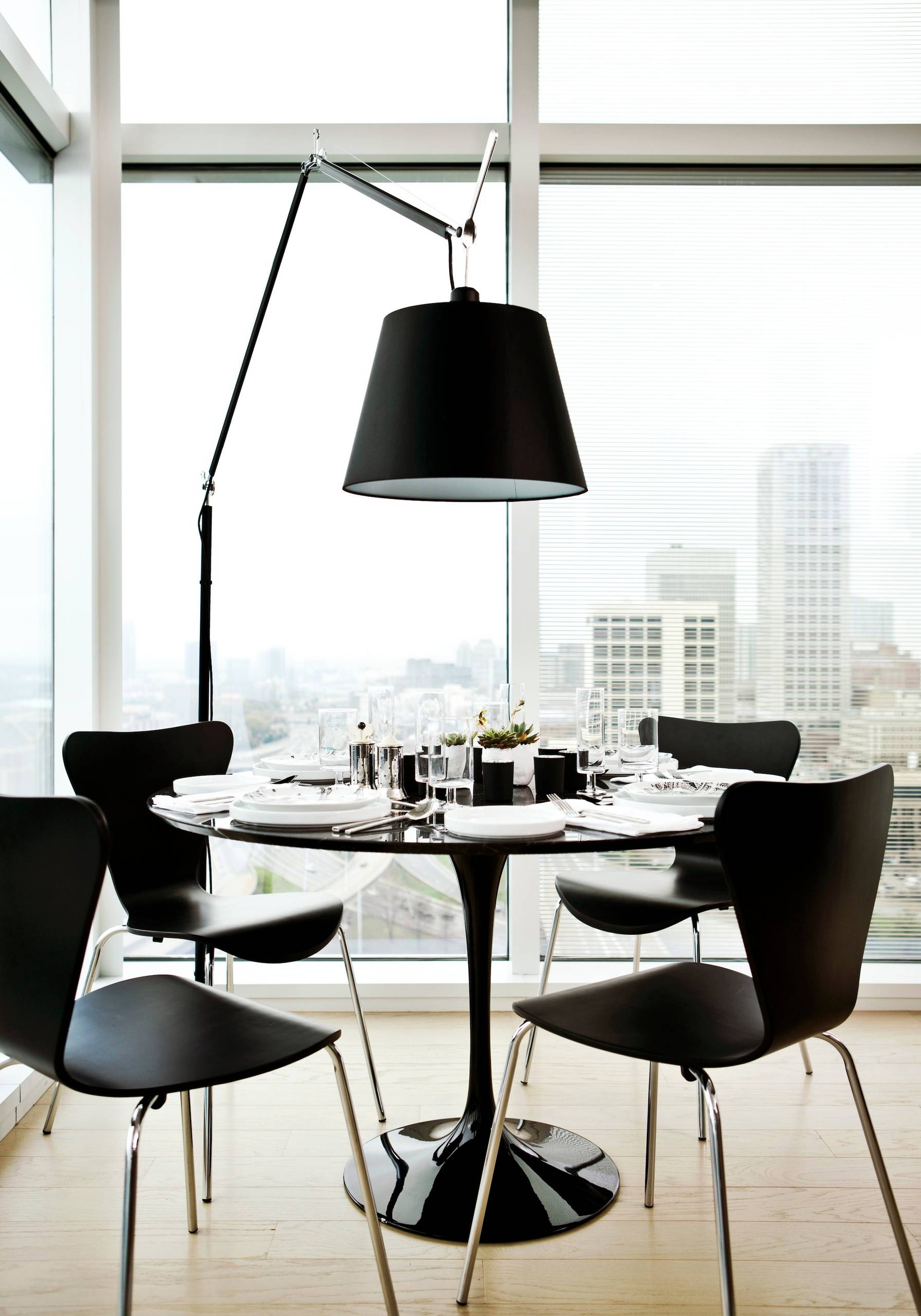 Para un conjunto sobrio… Su modelo más masculino, el de color negro, es el idóneo para articular ambientes sobrios y ochenteros, en particular si se combina con otros muebles y complementos en blanco y negro, como se ha hecho aquí con la mesa Tulip y la lámpara de pie XXL más el menaje en blanco, con un resultado de lo más atractivo.