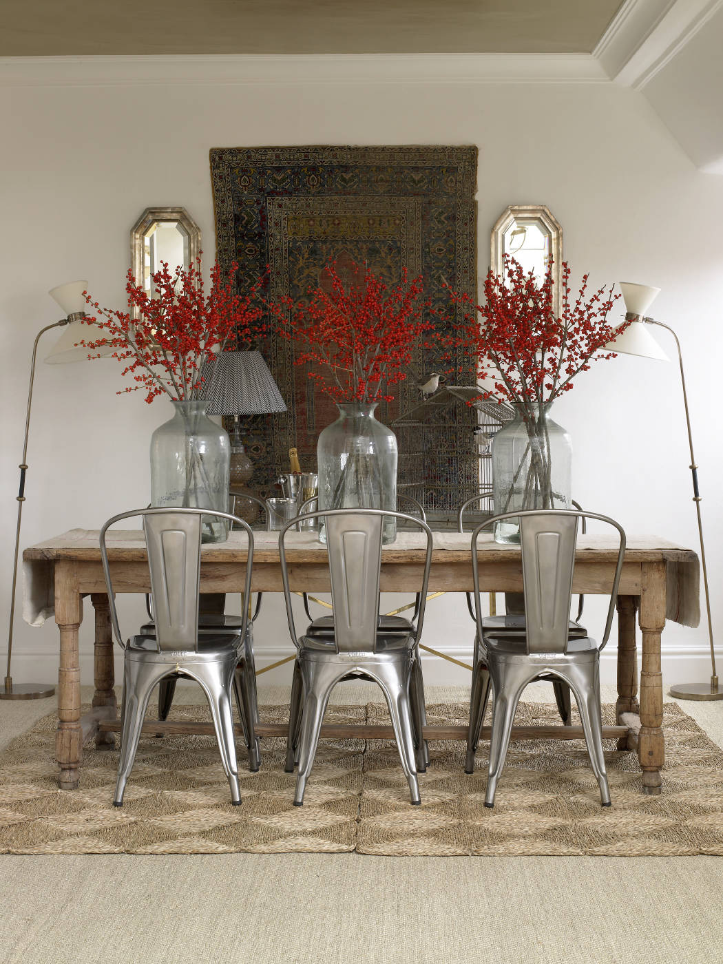 Para comedores de grandes dimensiones y centros que pueden permanecer en la mesa aún y cuando no se esté utilizando, atrévete con un espectacular bodegón con jarrones de gran formato y ramas naturales o secas. Cuida la proporción de los elementos: cuanto más grande sea la base, más grandes y altas deberán ser las ramas decorativas.