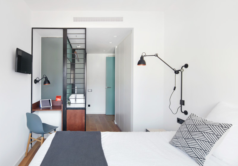 Por último, no se debe llenar la habitación de muebles y hay que procurar que haya proporción con la escala del espacio. Poco más que una mesita de noche blanca bastará. Finalmente, es buena idea añadir un toque personal; por ejemplo con un rincón de relax en el que haya un puf o una butaca.
