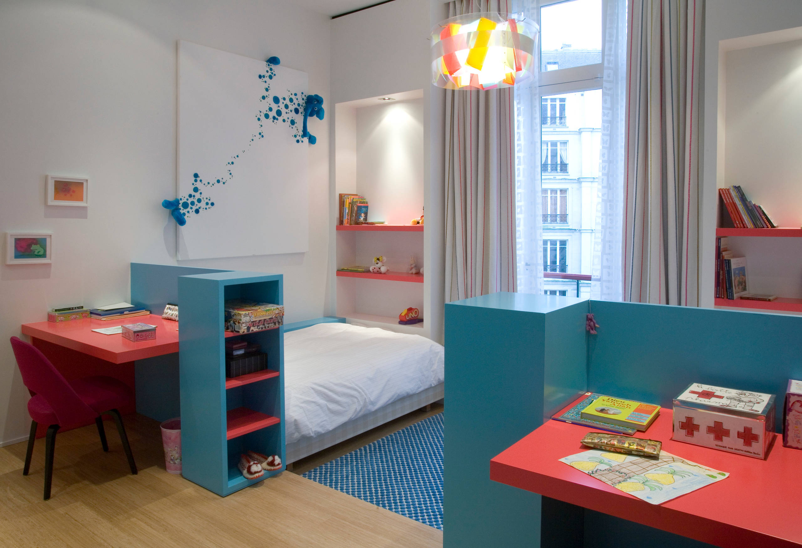 - Espacios amplios, uno frente al otro. En un dormitorio grande, se debe colocar el escritorio en el medio y situar a los hermanos enfrentados.