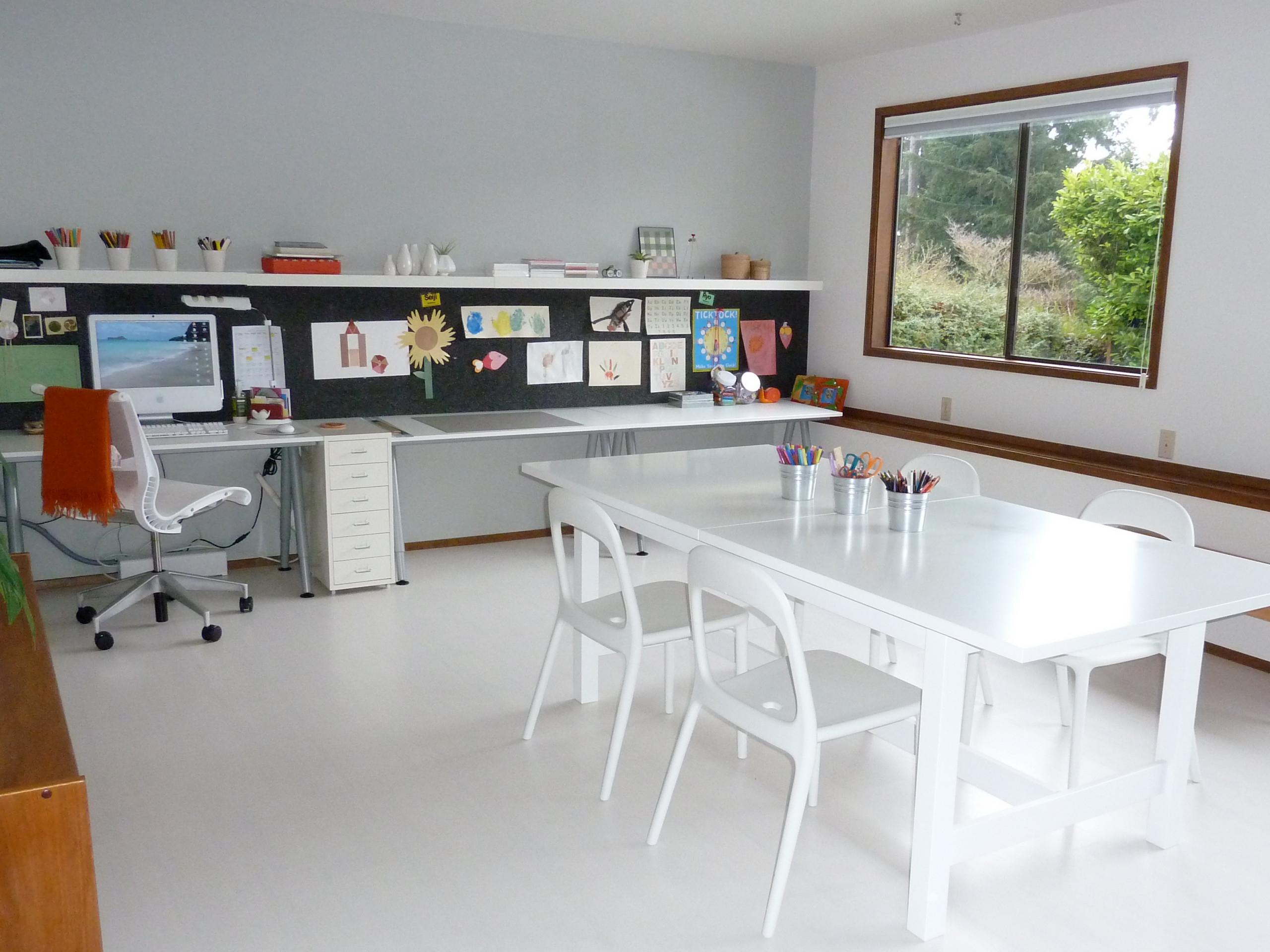 Si se cuenta con el espacio suficiente se puede añadir una mesa complementaria donde dibujar o hacer manualidades, tareas más lúdicas que invitan a conversar e intercambiar opiniones.