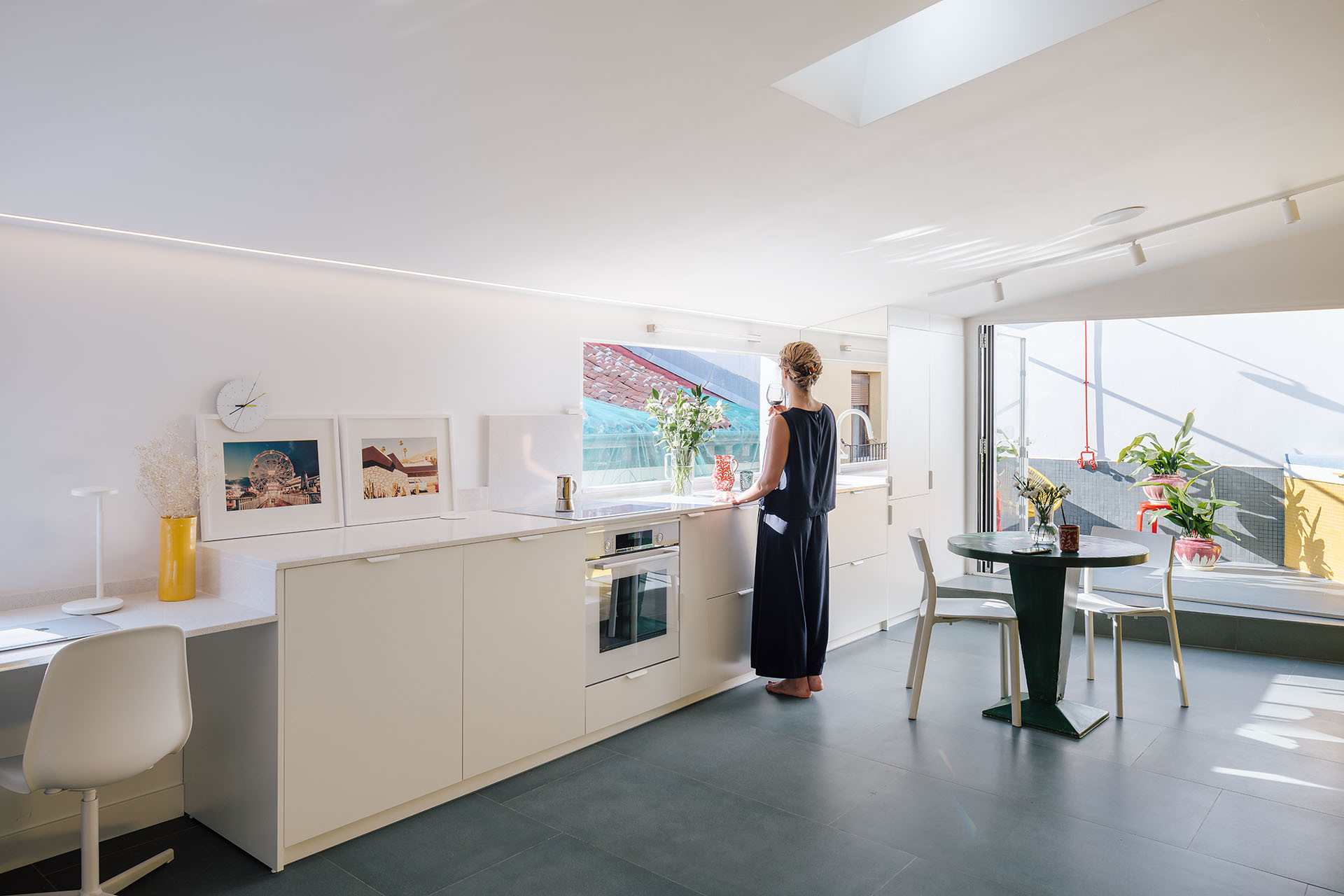 En esta otra buhardilla en el centro de Madrid, rehabilitada también por Gon Aquitects, el arquitecto Gonzalo Pardo deja libre la zona central del área multifuncional a través del diseño de un sistema de almacenaje perimetral y a distintas alturas (según la inclinación de la cubierta), que cuenta, además, con un mobiliario flexible y esencial. Además, gana perspectivas y amplitud visual hacia la terraza y refuerza la entrada de luz natural con una ventana de tejado y el redimensionamiento de la ventana existente.