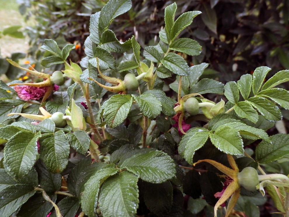 Las rosas antiguas (en la fotografía, una de las más conocidas y prestigiosas, Rosa rugosa o spinossisima), deben podarse tras la floración cortando ramilletes de brotes pasados, ya que es en ellos donde se alojan estas corolas que casi nunca aparecen aisladas o por separado.
