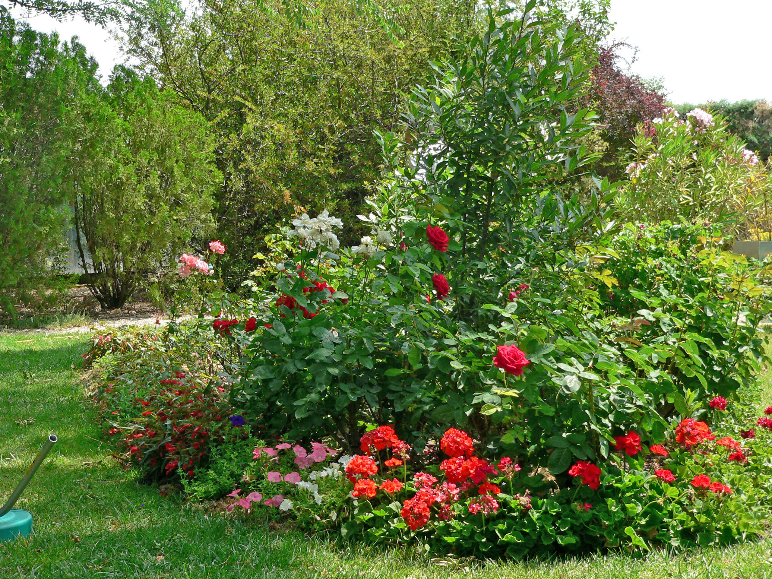 En este macizo puedes observar geranios, verbenas, ipomeas, laurel… Pero también hay rosas. Rosas que descollan sobre todo por su belleza, color, forma, fragancia… La imagen, tomada en época de descanso floral, muestra cómo es posible contar con rosas en cualquier momento.
