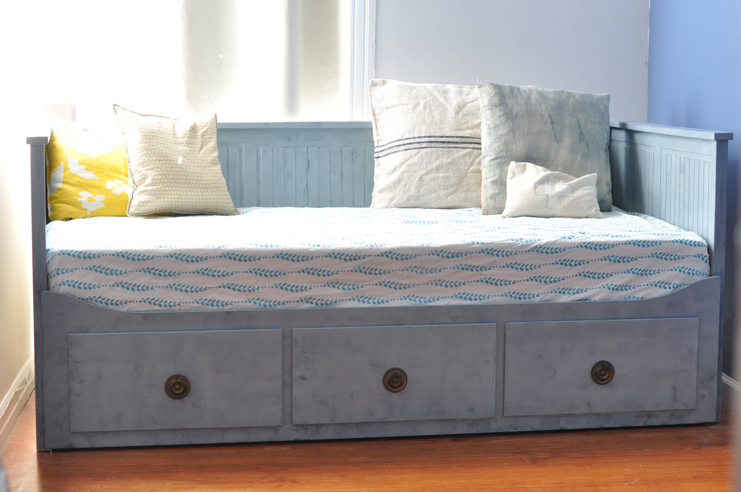 Retira todos los cajones y cualquier accesorio del mueble y colócalo sobre unos ladrillos o bloques de madera cubiertos con un trapo. Lima la superficie y retira el polvo resultante. Coloca cinta de pintar en las esquinas y los cajones. Dale una primera capa con tapaporos y déjalo que se seque.
